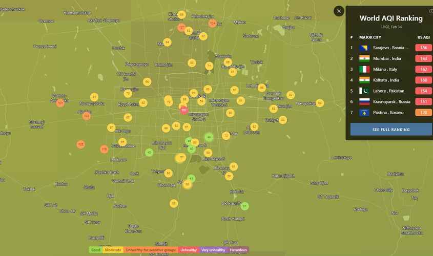 В 18.00 статус города отмечен как «нездоровый для чувствительных групп». Индекс качества воздуха, по данным сайта, составляет 62 (AQI).