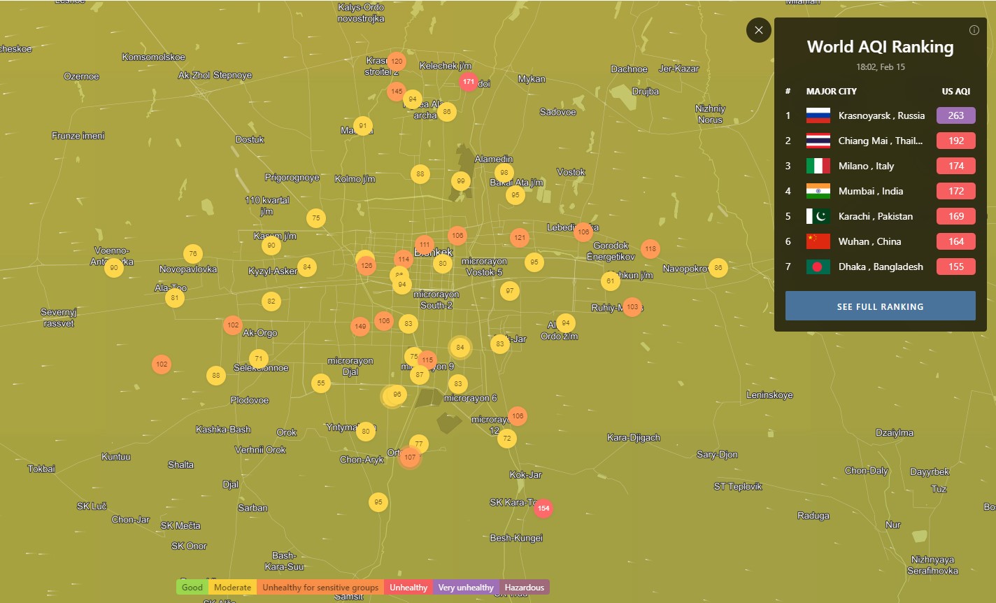 В рейтинге крупнейших городов мира по качеству воздуха World Air Quality Бишкек поднялся на 40-е место.