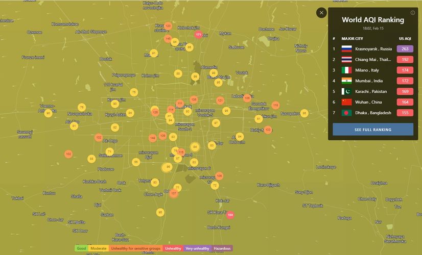 В 18.00 статус города отмечен как «нездоровый для чувствительных групп». Индекс качества воздуха, по данным сайта, составляет 87 (AQI).