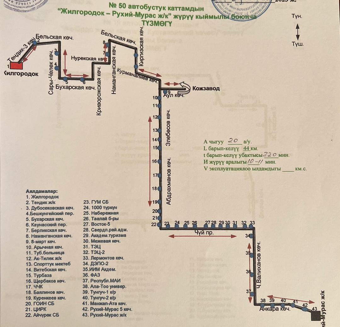 Маршрут № 50 — «Жилгородок» — жилмассив «Рухий-Мурас», протяженность 44 километра, интервал — 7 минут. Выделено 19 автобусов.
