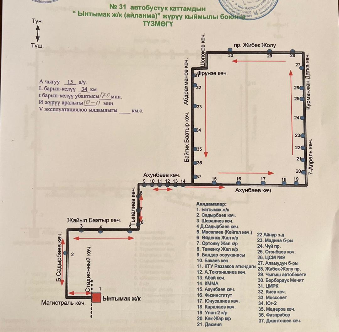 Маршрут № 31 — жилмассив «Ынтымак» — кольцевой, протяженность 34 километра, интервал — 7 минут. Выделено 24 автобуса.