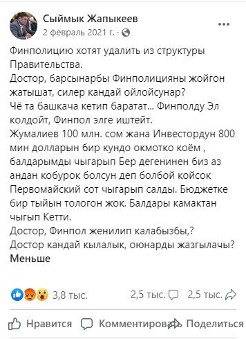 «Чета башкача кетип баратат» в переводе «Что-то пошло не так». Фраза появилась благодаря бывшему главе Финпола Сыймыку Жапыкееву. Когда он узнал, что его ведомство ликвидируют, написал пост, в котором задался вопросами и был озадачен решением властей. «Чета башкача кетип баратат», — отреагировал бывший чиновник. Выражение стали использовать в определенных кругах, иногда сокращенную версию «Чета башкача...», когда что-то идет не по плану или не так, как ожидалось.Экидос