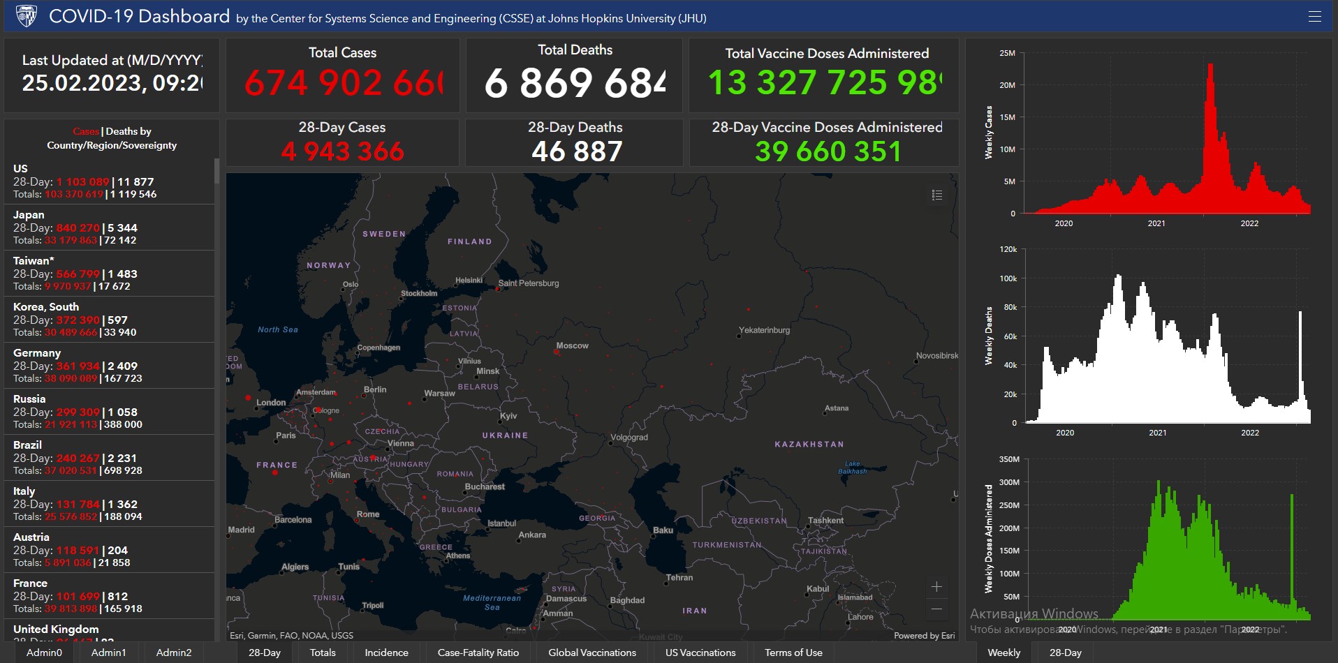 Всего в мире с начала пандемии коронавирусом заразились 674 миллиона 902 тысячи 660 человек. Больше всего в США (103 миллиона 370 тысяч 619), Индии (44 миллиона 685 тысяч 619), Бразилии (37 миллионов 20 тысяч 531), Франции (39 миллионов 813 тысяч 898), Великобритании (24 миллиона 603 тысячи 373), России (21 миллион 921 тысяча 113), Турции (17 миллионов 42 тысячи 722), Аргентине (10 миллионов 43 тысячи 308), Иране (7 миллионов 567 тысяч 560), Колумбии (6 миллионов 357 тысяч 173), Испании (13 миллионов 763 тысячи 336), Италии (25 миллионов 576 тысяч 852) и Германии (38 миллионов 90 тысяч 89).