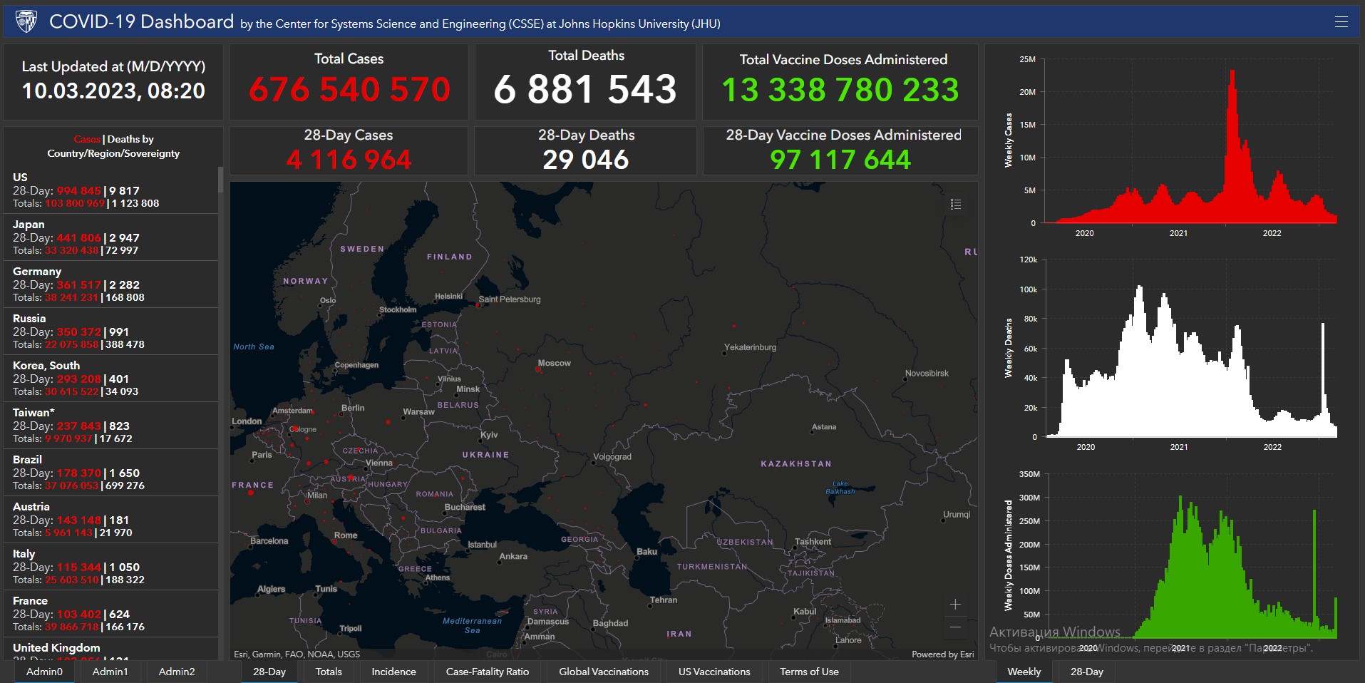 Всего в мире с начала пандемии коронавирусом заразились 676 миллионов 540 тысяч 570 человек. Больше всего в США (103 миллиона 800 тысяч 969), Индии (44 миллиона 689 тысяч 72), Бразилии (37 миллионов 76 тысяч 53), Франции (39 миллионов 866 тысяч 718), Великобритании (24 миллиона 658 тысяч 705), России (22 миллиона 75 тысяч 858), Турции (17 миллионов 42 тысячи 722), Аргентине (10 миллионов 44 тысячи 957), Иране (7 миллионов 572 тысячи 311), Колумбии (6 миллионов 359 тысяч 93), Испании (13 миллионов 770 тысяч 429), Италии (25 миллионов 603 тысячи 510) и Германии (38 миллионов 241 тысяча 231).Количество смертей от коронавируса достигло 6 миллионов 881 тысячи 543. За сутки показатель вырос на 1 тысячу 717 человек. В том числе в США всего с начала пандемии скончались 1 миллион 123 тысячи 808 человек, Бразилии — 699 тысяч 276, Индии — 530 тысяч 776, Мексике — 333 тысячи 170, России — 388 тысяч 478, Великобритании — 220 тысяч 721, Италии — 188 тысяч 322.