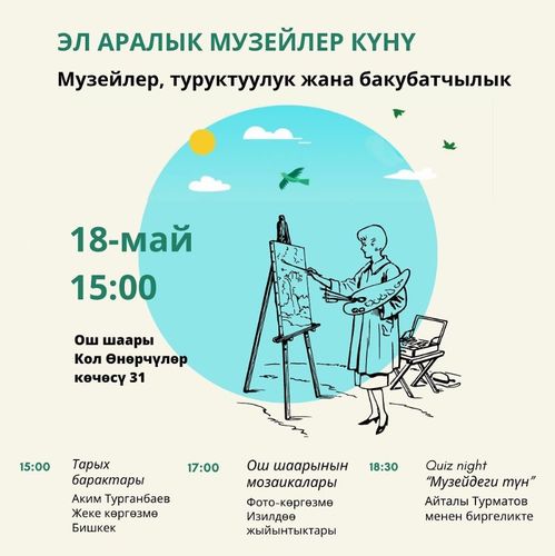 В рамках акции откроется персональная выставка Акима Турганбаева «Страницы истории», фотовыставка «История мозаики города Ош» и викторина «Ночь в музее». Начало в 15.00.