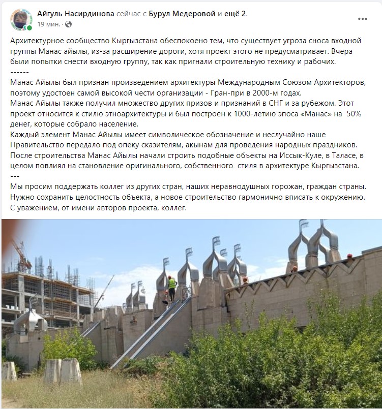Архитектурное сообщество Кыргызстана обеспокоено угрозой сноса входной группы «Манас айылы» из-за расширения дороги. Об этом в Facebook написала архитектор Айгуль Насирдинова.