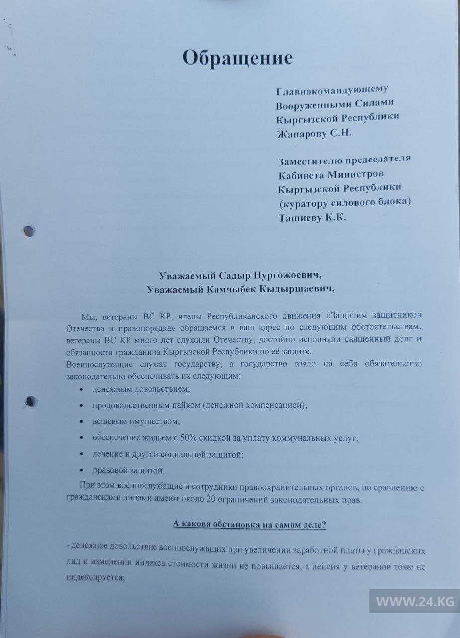 Члены республиканского движения «Защитим защитников Отечества и правопорядка» направили обращение с вышеуказанными и другими требованиями президенту и главнокомандующему ВС КР Садыру Жапарову и заместителю председателя кабмина, курирующему силовой блок, главе ГКНБ Камчыбеку Ташиеву.