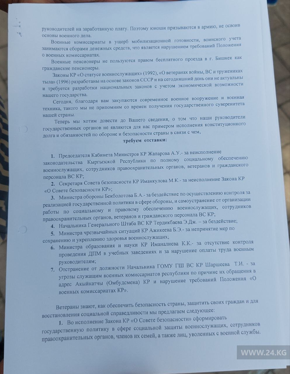 Помимо этого, ветераны ВС КР требуют отстранения от должности начальника Главного организационно- мобилизационного управления Генштаба ВС КР Т.И. Шаршеева за угрозы служащим военных комиссариатов республики по причине их обращения в адрес омбудсмена.