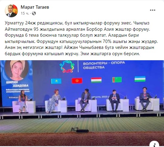 Он отметил, что мероприятие не форум волонтеров, а Центральноазиатский молодежный форум, посвященный 95-летию Чингиза Айтматова.