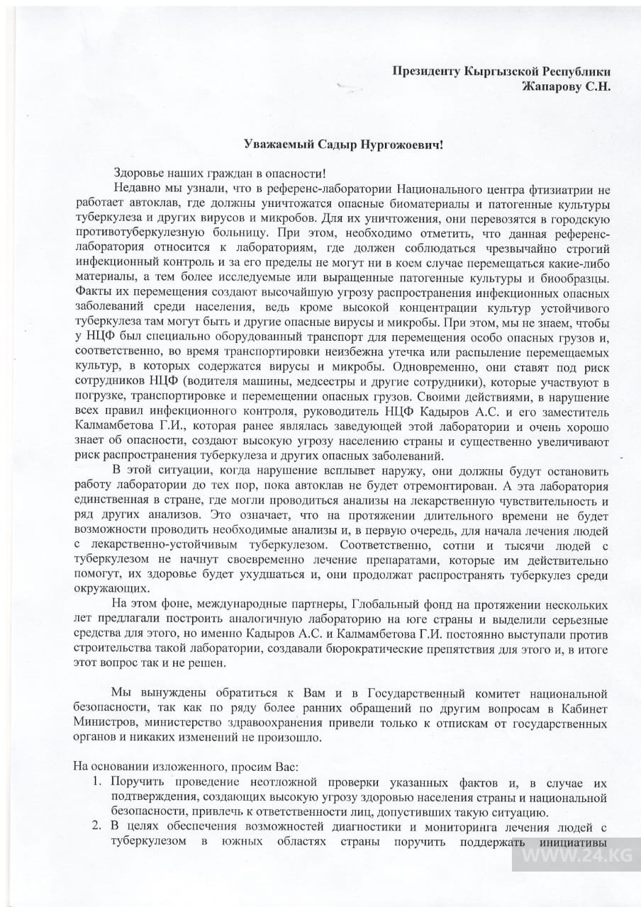 «Мы обратились к президенту, подали заявление в ГКНБ о необходимости принятия незамедлительных мер для ликвидации биологической угрозы для населения и привлечения к ответственности должностных лиц Минздрава и Наццентра фтизиатрии», — говорится в сообщении.