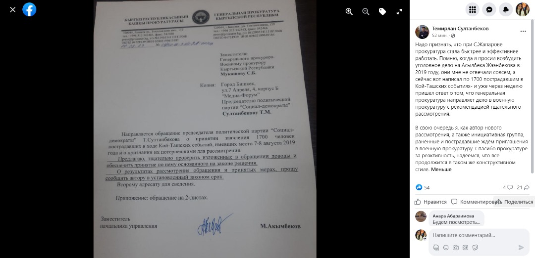 «Помню, когда я просил возбудить уголовное дело на Асылбека Жээнбекова в 2019 году, они мне не отвечали совсем, а сейчас вот написал по 1,7 тысячи пострадавших в кой-ташских событиях — и уже через неделю пришел ответ о том, что генеральная прокуратура направляет дело в Военную прокуратуру с рекомендацией тщательного рассмотрения. В свою очередь я, как автор нового рассмотрения, а также инициативная группа, раненые и пострадавшие, ждем приглашения в Военную прокуратуру. Спасибо прокуратуре за реактивность, надеемся, что все продолжится в таком же конструктивном стиле», — написал Темирлан Султанбеков.