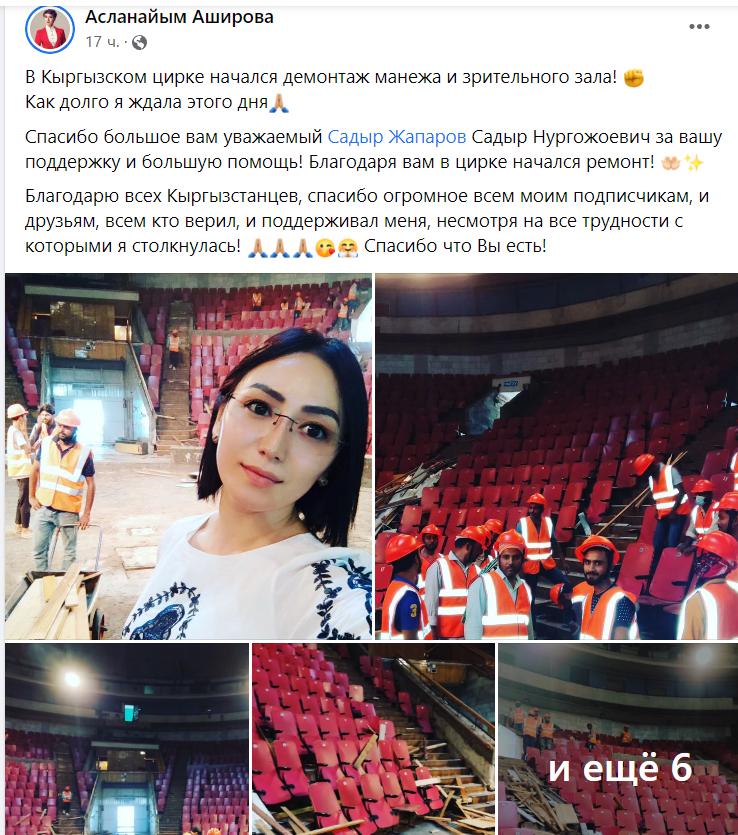 «Начался демонтаж манежа и зрительного зала. Как долго я ждала этого дня! Спасибо большое, уважаемый Садыр Нургожоевич, за поддержку и большую помощь. Благодаря вам в цирке начался ремонт», — написала она.