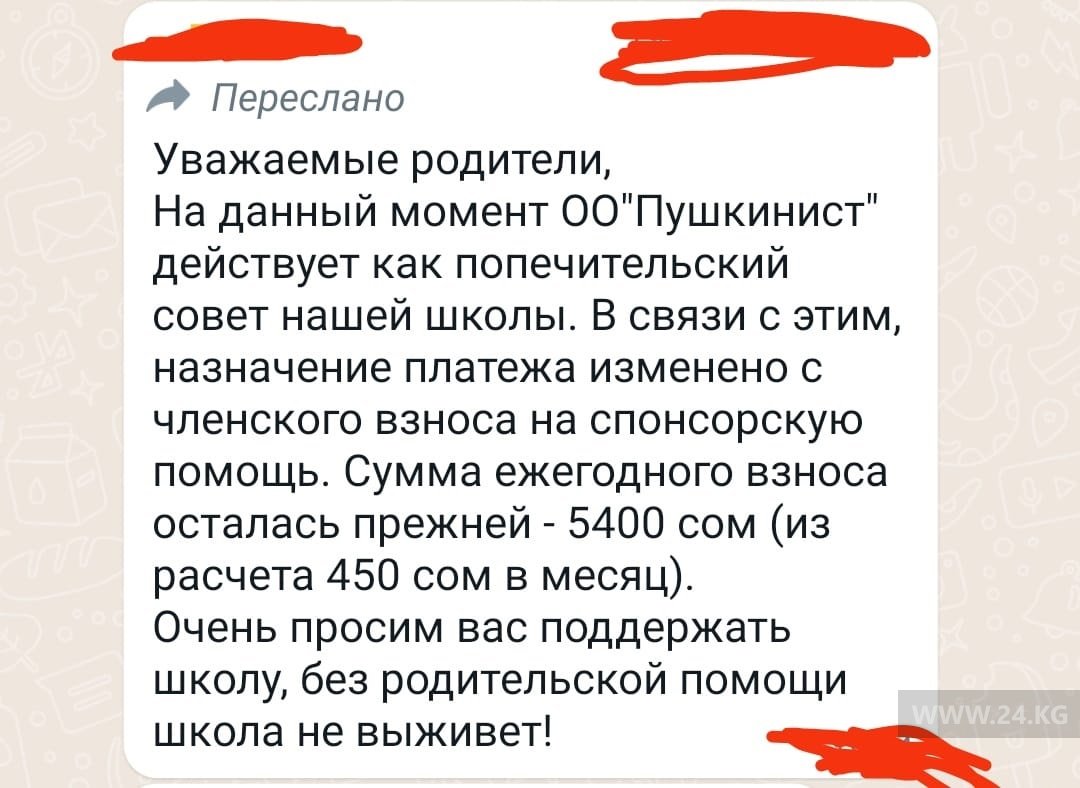 Несмотря на указ президента о запрете денежных сборов в общеобразовательных организациях, в столичной школе-гимназии № 17 имени Пушкина начали сбор денег. Об этом 24.kg сообщили родители.