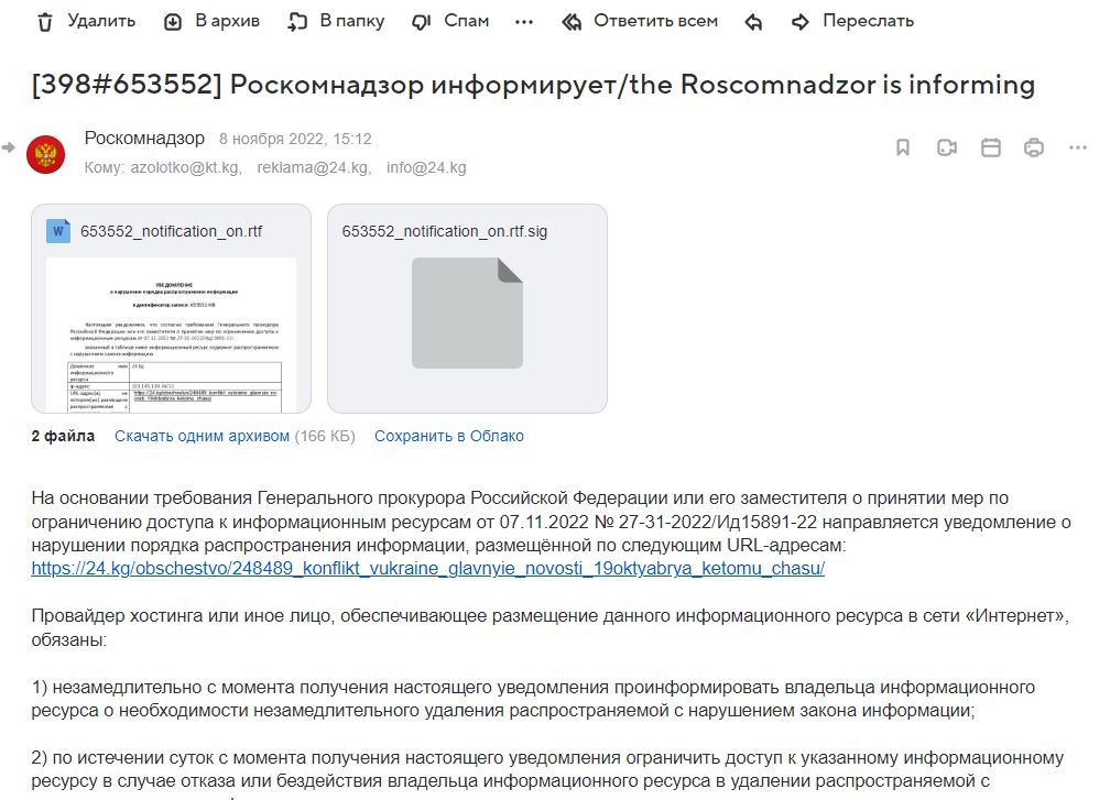 Отметим, что осенью прошлого года на почту редакции пришло несколько писем от Роскомнадзора с ...требованием удалить некоторые публикации. Все они касались дайджеста о событиях в Украине. ИА 24-kg.com отказалось удалять тексты, поскольку они никоим образом не нарушали действующее в Кыргызстане национальное законодательство.