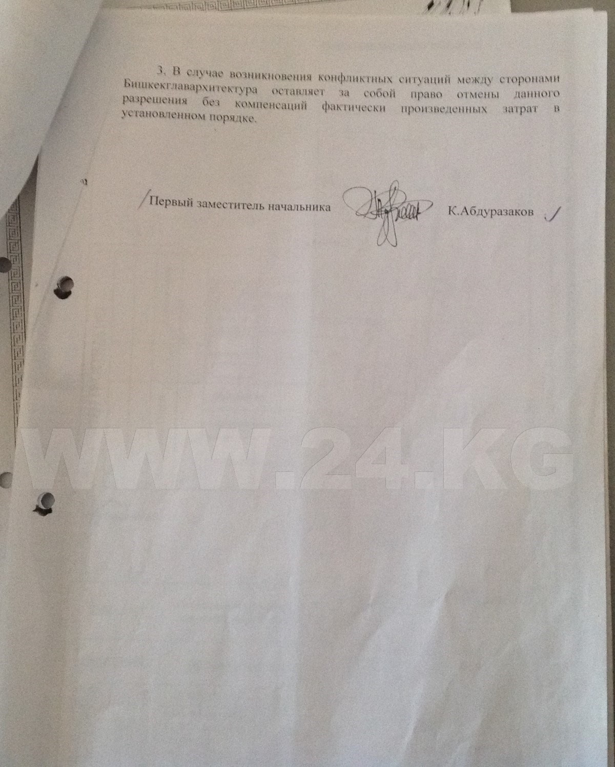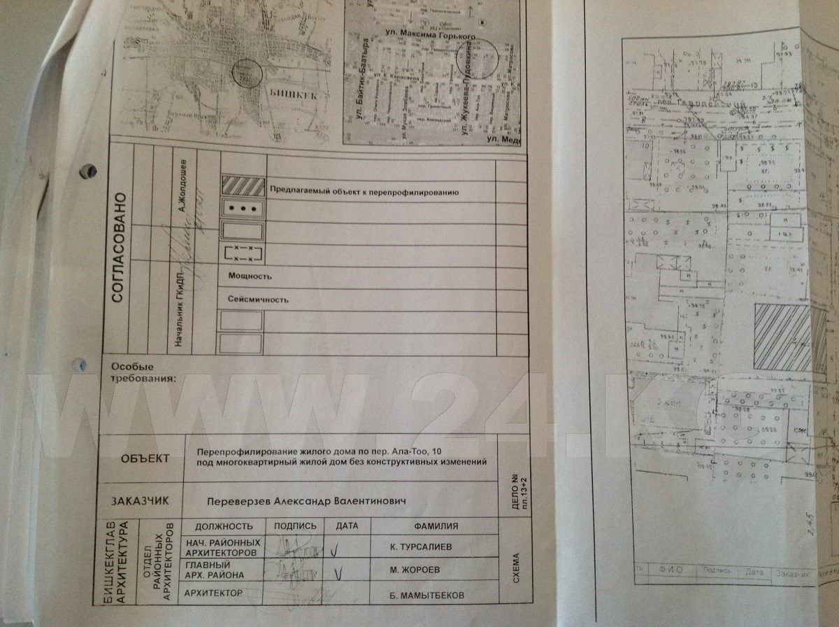 В пакете документов имеется служебная записка от 15 февраля 2011 года за подписью главного архитектора Октябрьского района Марата Жороева, в которой он сообщает, что «отдел районных архитекторов повторно возвращает материалы на перепрофилирование жилого дома по адресу переулок Ала-Тоо,10, так как документы в полном объеме не представлены.