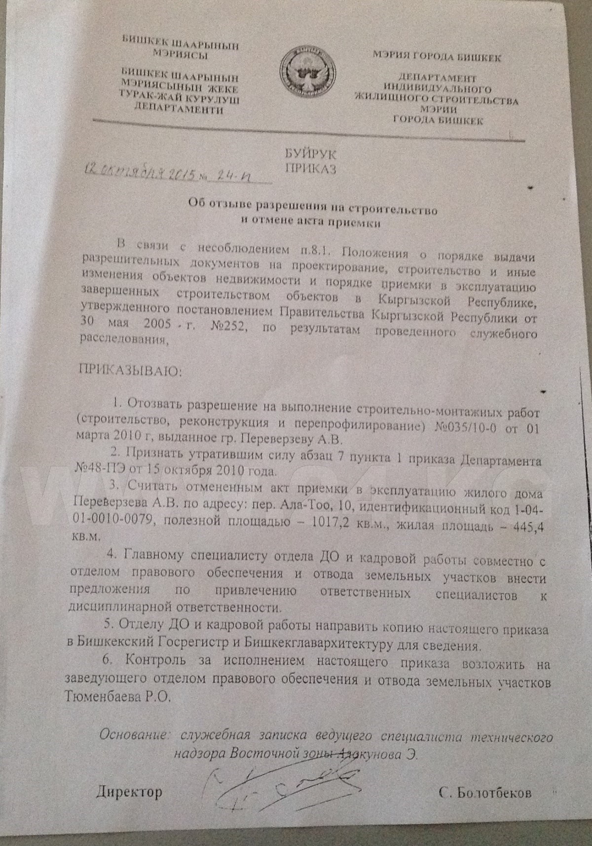 У автора материала ушло две недели, чтобы выяснить судьбу письма, отправленного ДИЖС в Бишкекглавархитектуру и в Государственную регистрационную службу (ГРС). Суть его состояла в том, что департамент ввиду нарушений при строительстве отзывает разрешительные документы и уведомляет остальные ведомства, чтобы последние приняли это к сведению.
