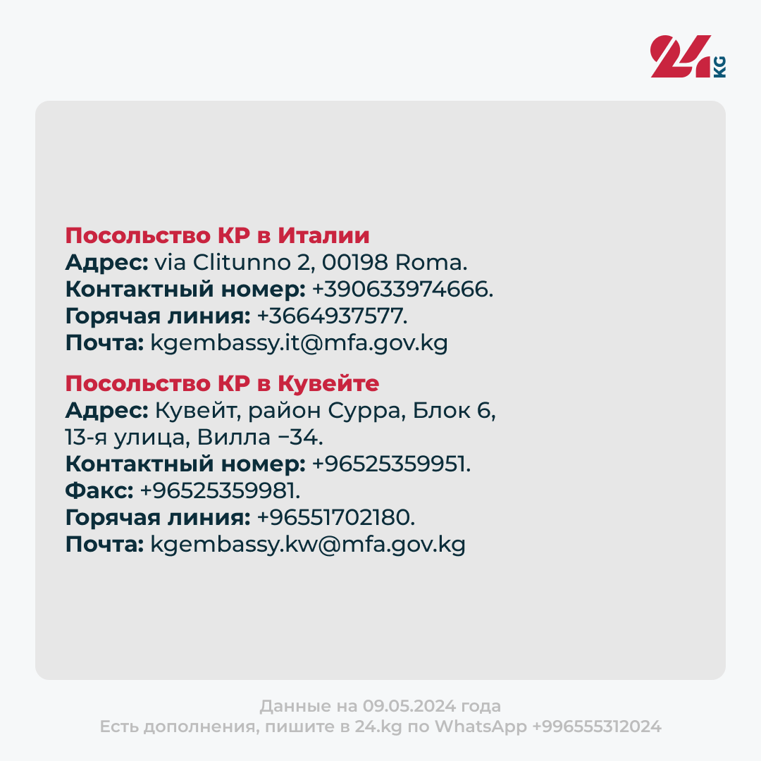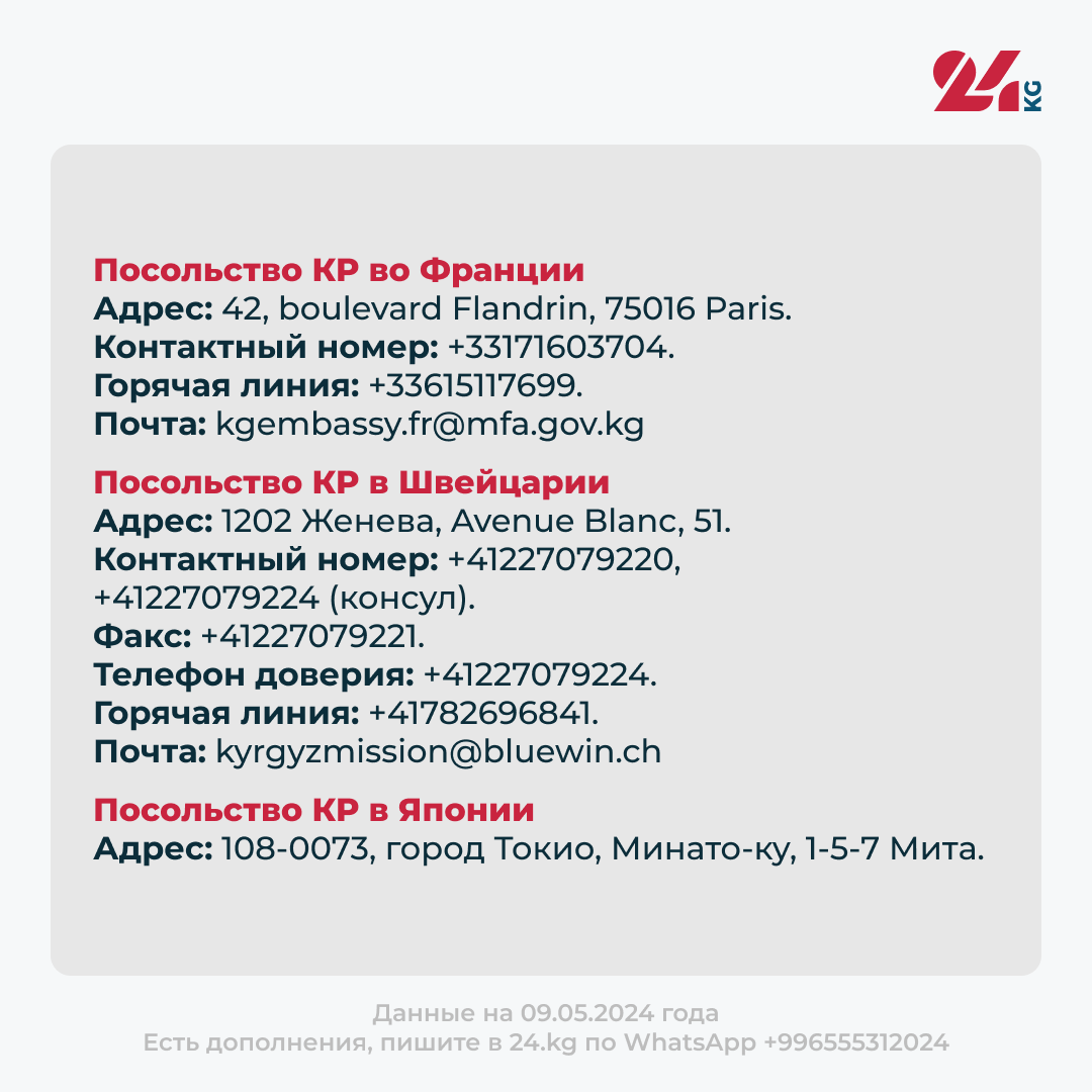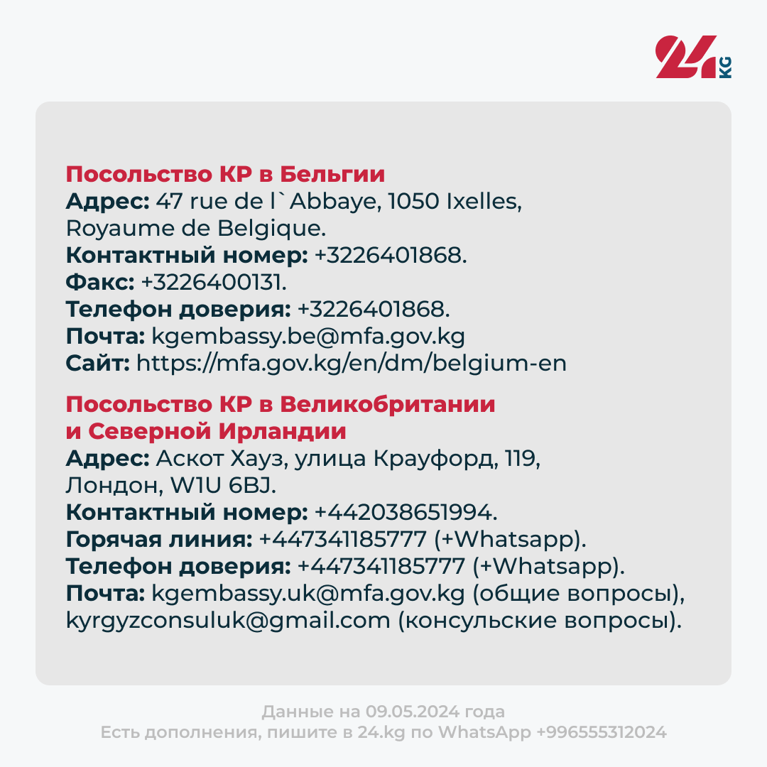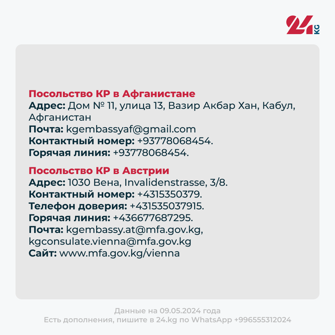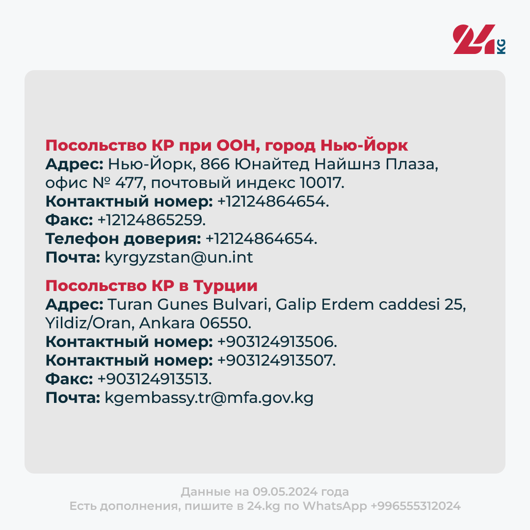 24.kg собрало контакты дипломатических представительств Кыргызстана в разных странах. В материале использованы данные сайта Министерства иностранных дел КР.