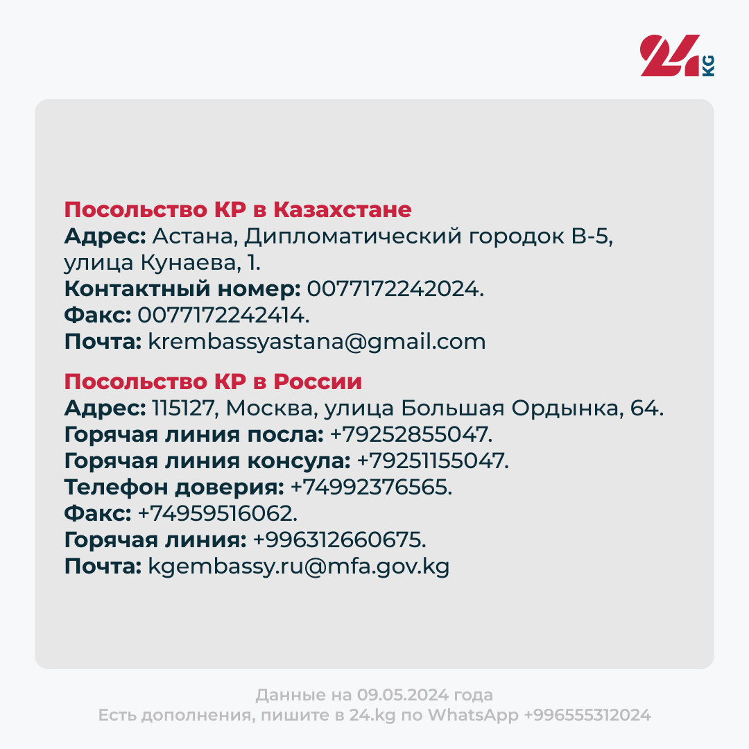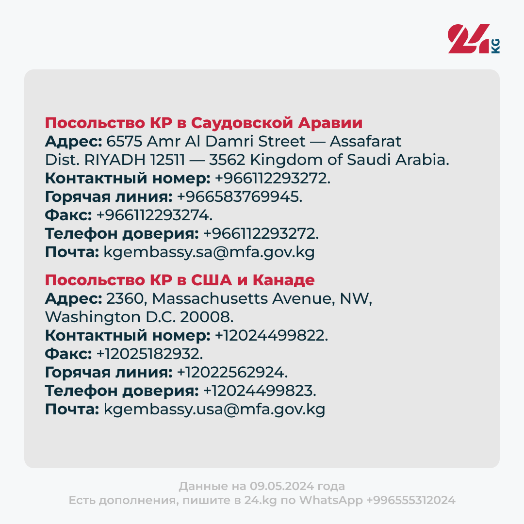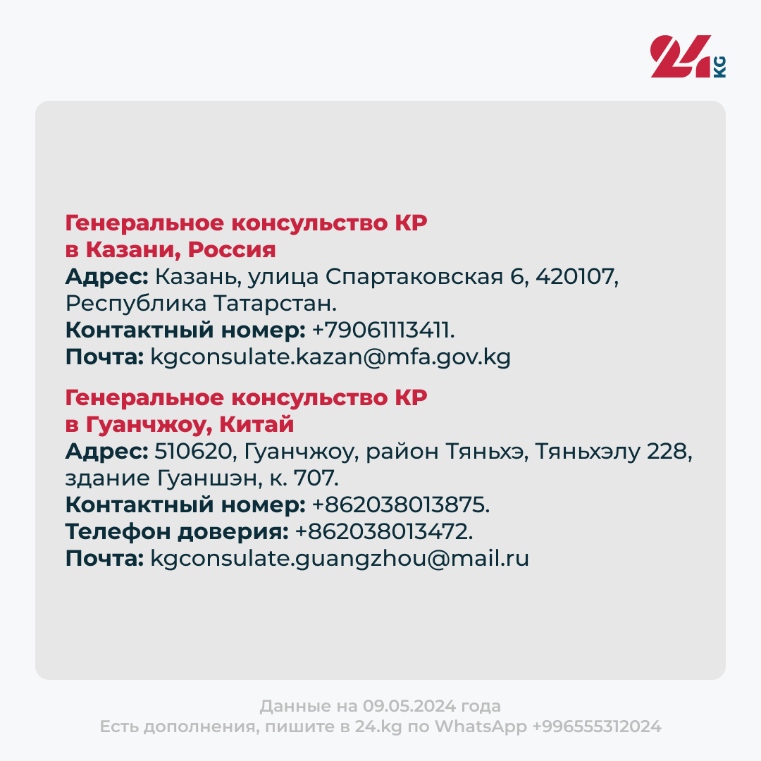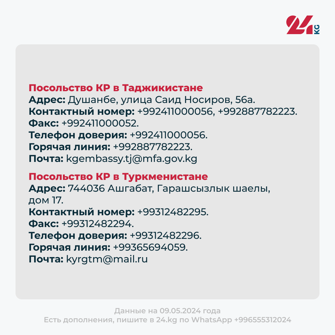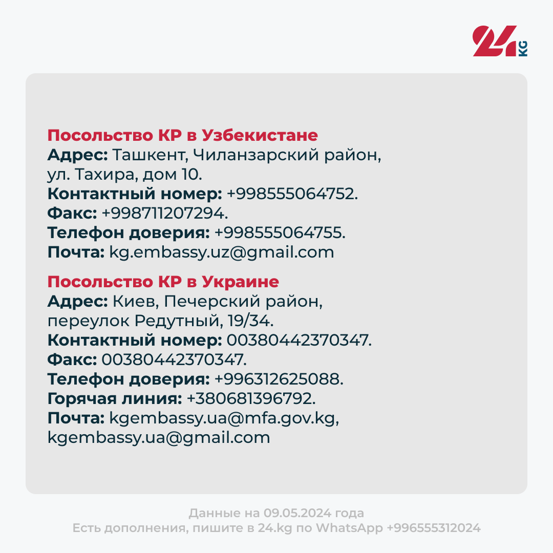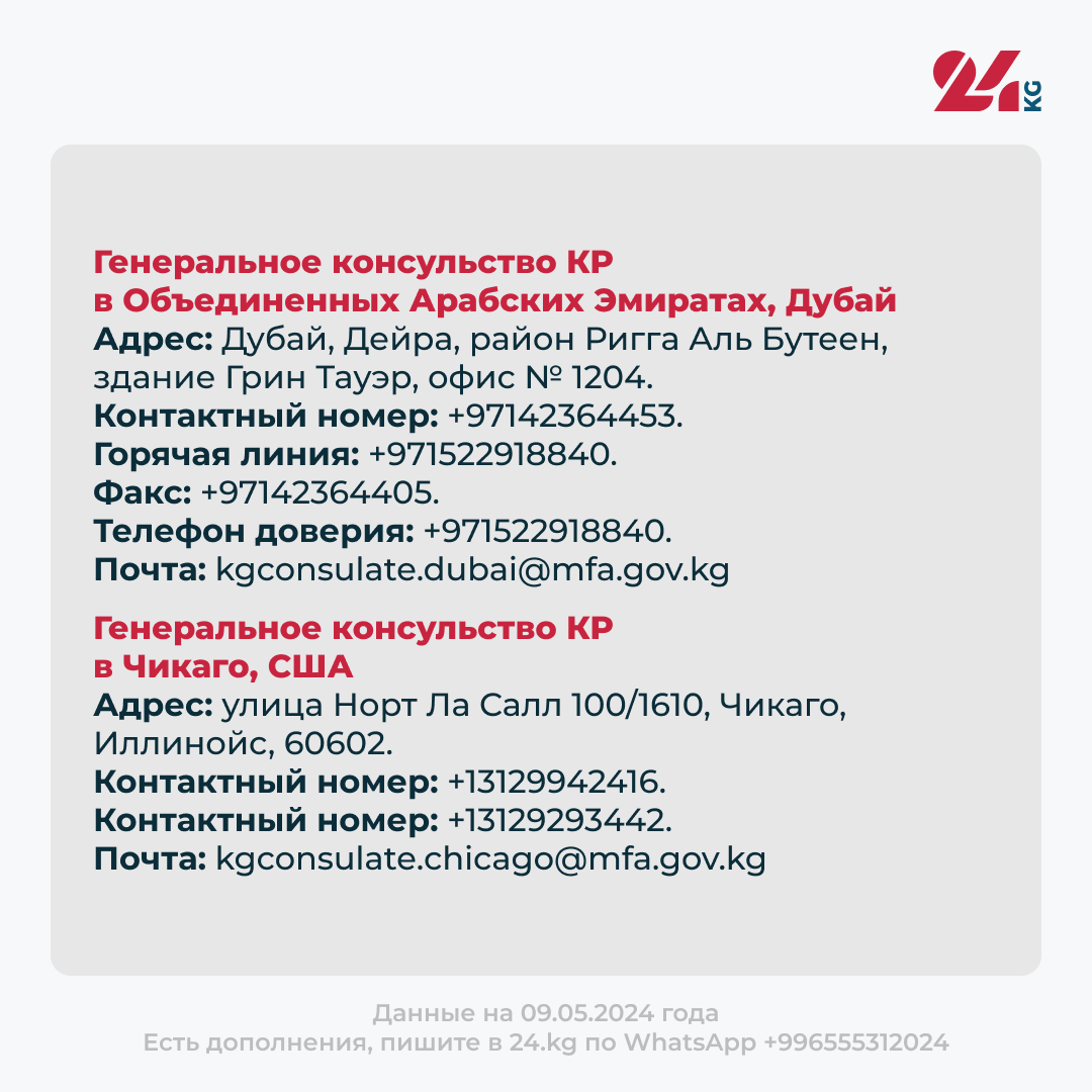 24.kg собрало контакты дипломатических представительств Кыргызстана в разных странах. В материале использованы данные сайта Министерства иностранных дел КР.