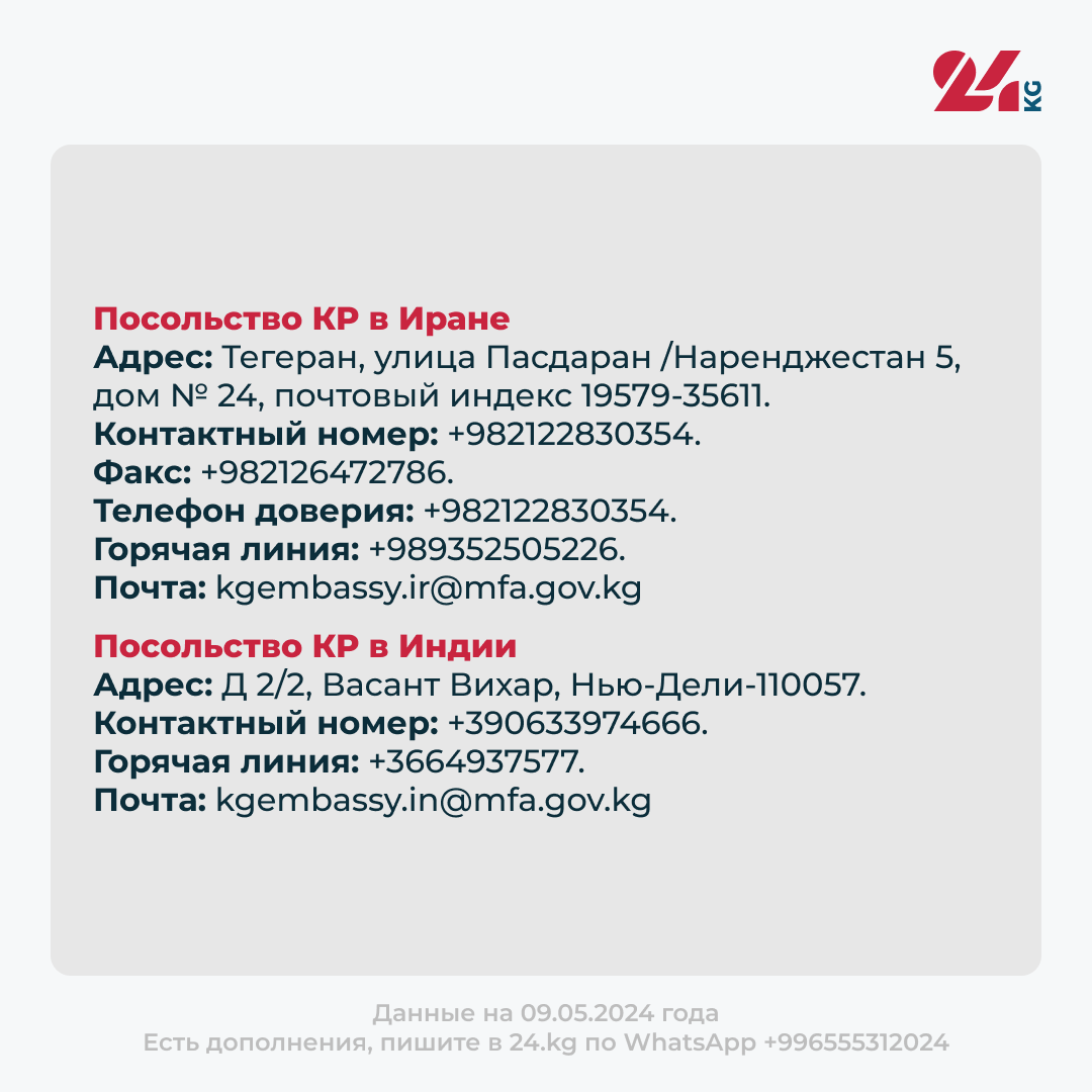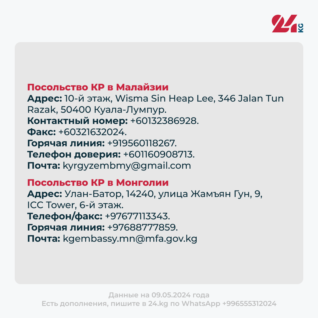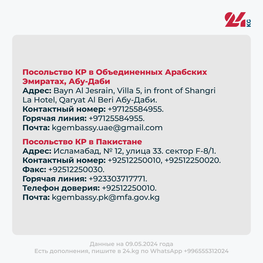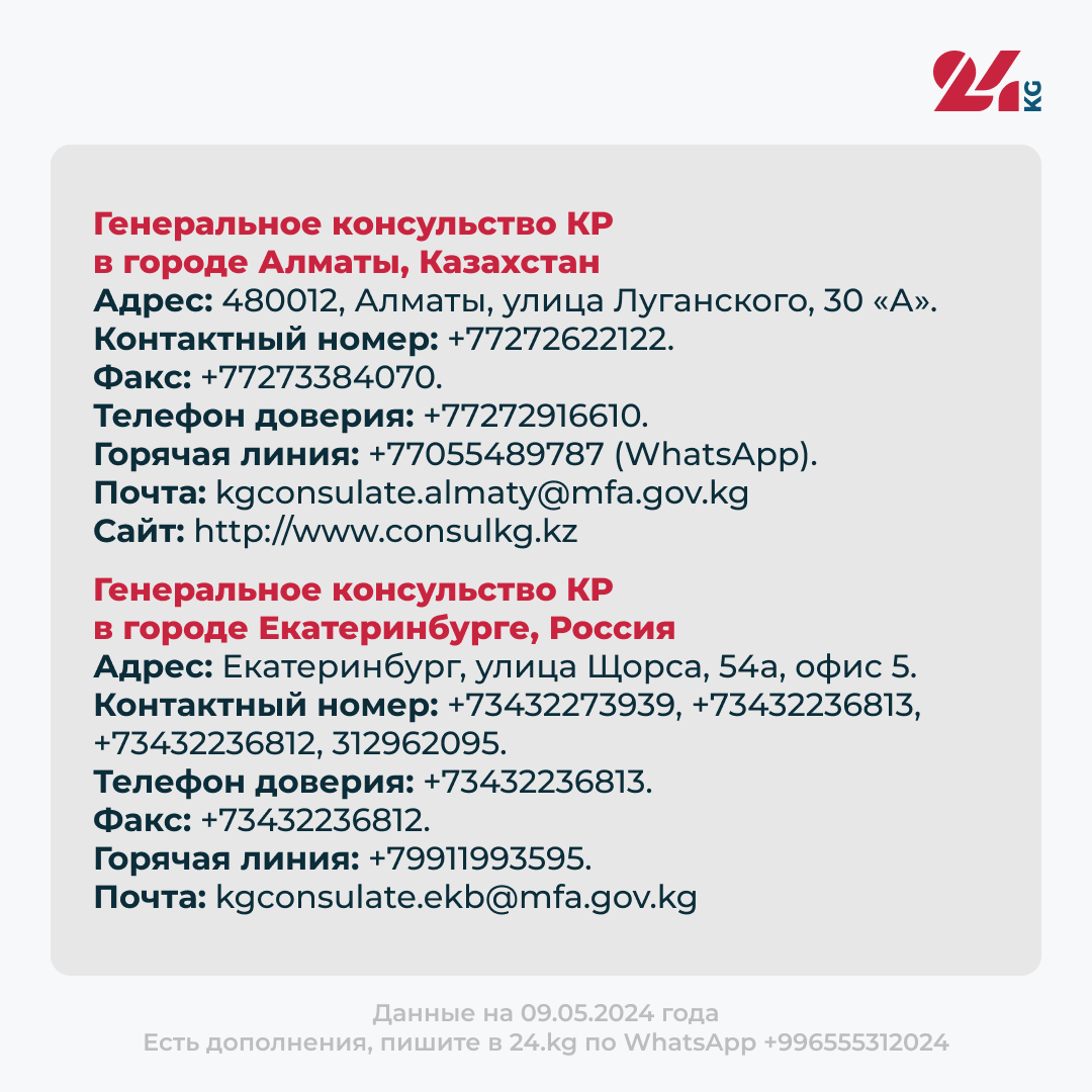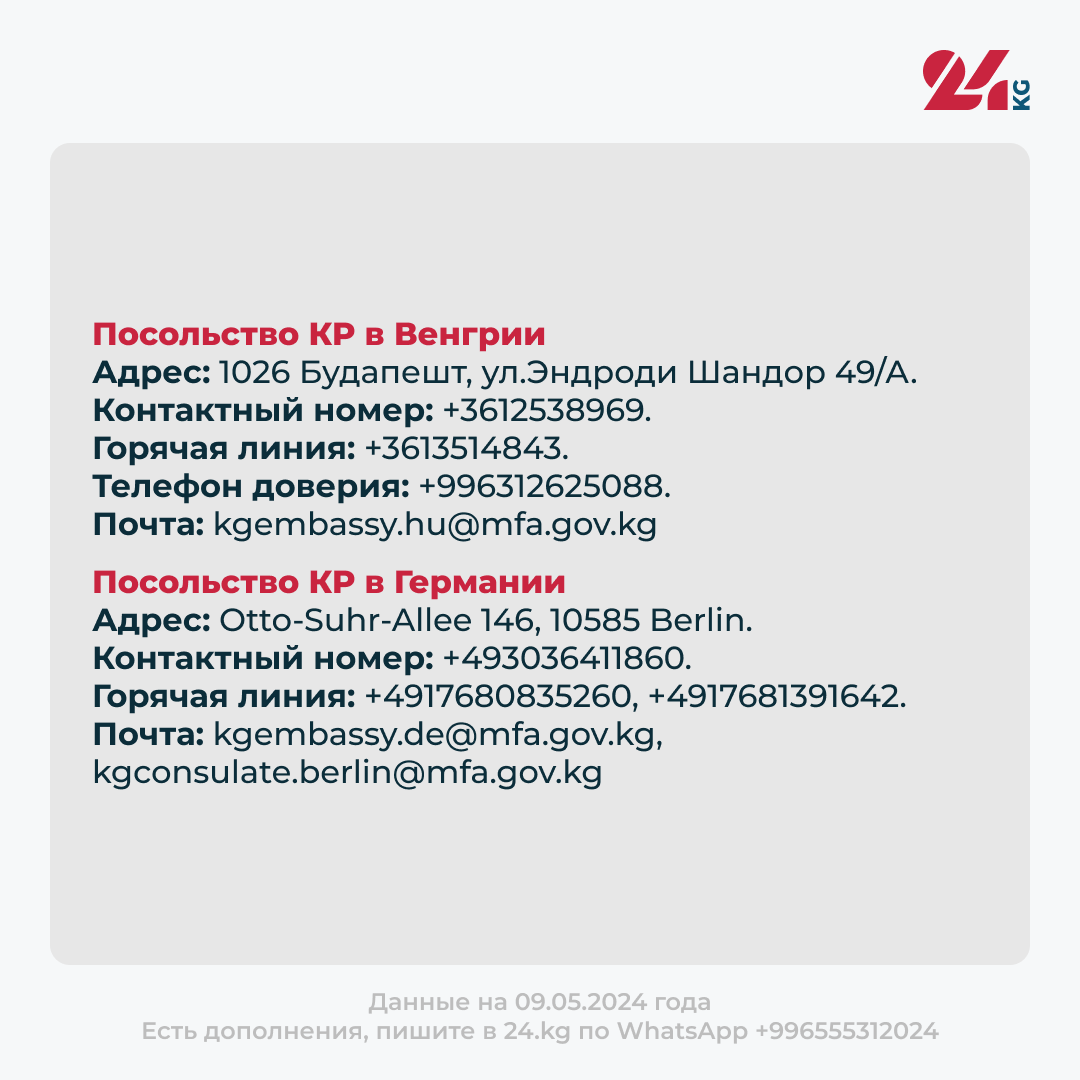 24.kg собрало контакты дипломатических представительств Кыргызстана в разных странах. В материале использованы данные сайта Министерства иностранных дел КР.
