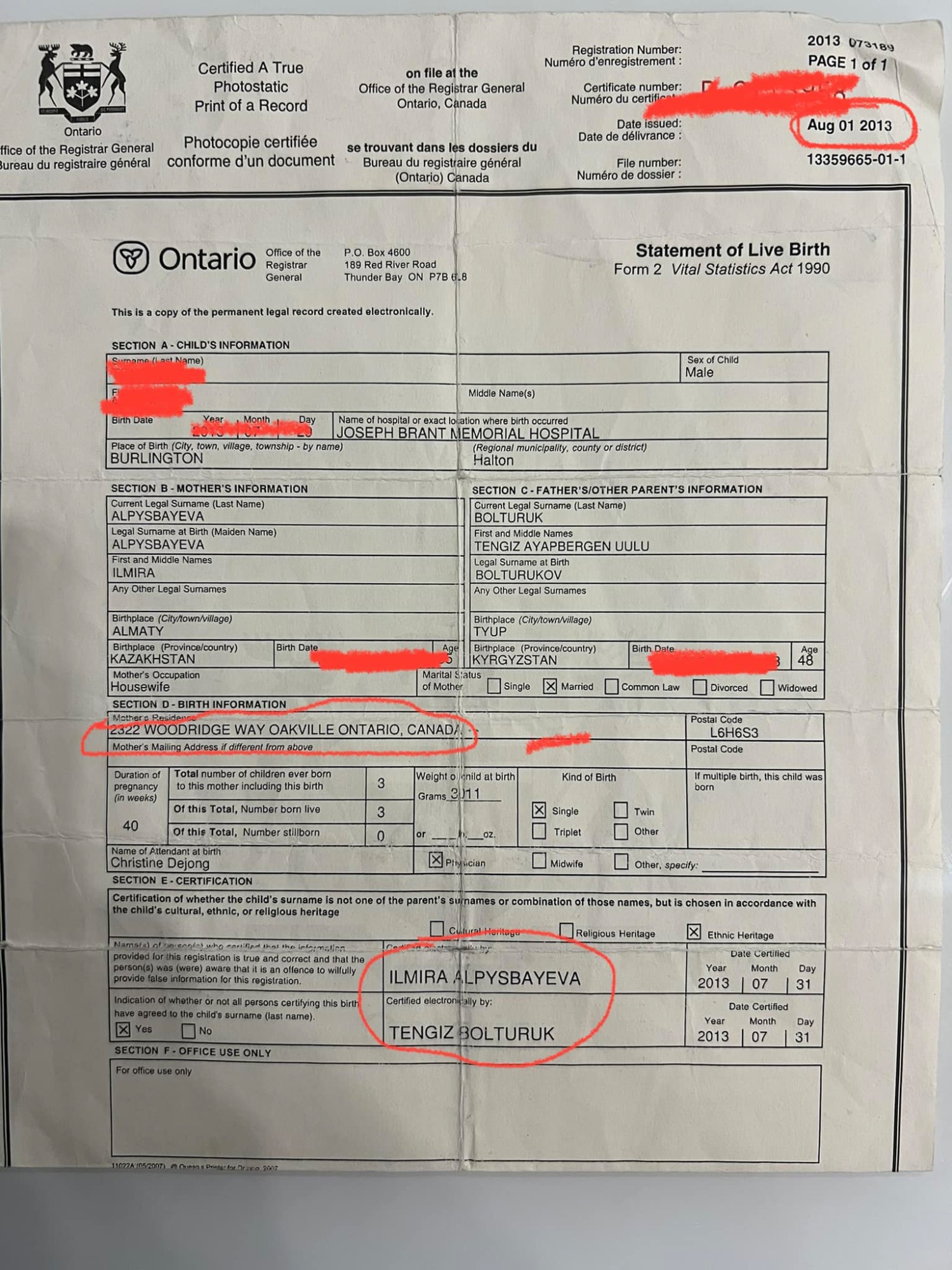 Жена Тенгиза Болтурука прикрепила к тексту фото документов, подтверждающих это, в том числе свидетельство о рождении ребенка от 1 августа 2013-го, в котором в графе о месте проживания матери значится адрес: 2322 Woodridge Way, Oakville, Canada, L6H6S3. Здесь находится дом Болтурука.