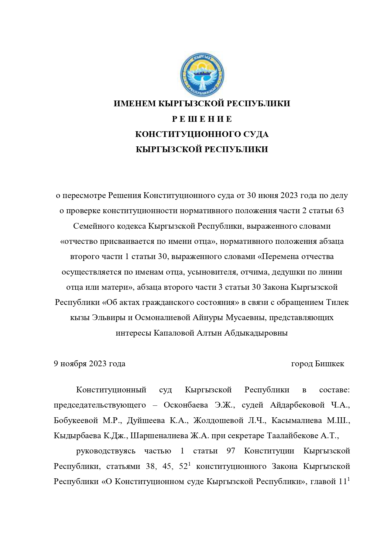 Напомним, коллегия Конституционного суда 30 июня вынесла решение по ходатайству адвокатов Эльвиры Тилек кызы и Айнуры Осмоналиевой, представляющих интересы Алтын Капаловой. В решении говорится, что по достижении совершеннолетия гражданин, который по тем или иным причинам, в том числе пережитым жизненным трагедиям, не приемлет мужское имя в качестве элемента своего полного имени, он должен иметь право выбора между отчеством и матчеством.