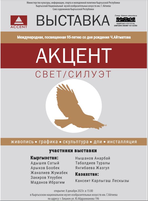 Представили свои работы активные и новые участники группы «Акцент»: Сатый Адышев, Бообек Арыков, Жумабек Жаналиев, Улуубек Закиров, Ибрагим Маданов, Анарбай Нышанов, Туралы Табалдиев, Жазгуль Янгибаева и художница из Казахстана Кансеит Карлыгаш Лескызы.