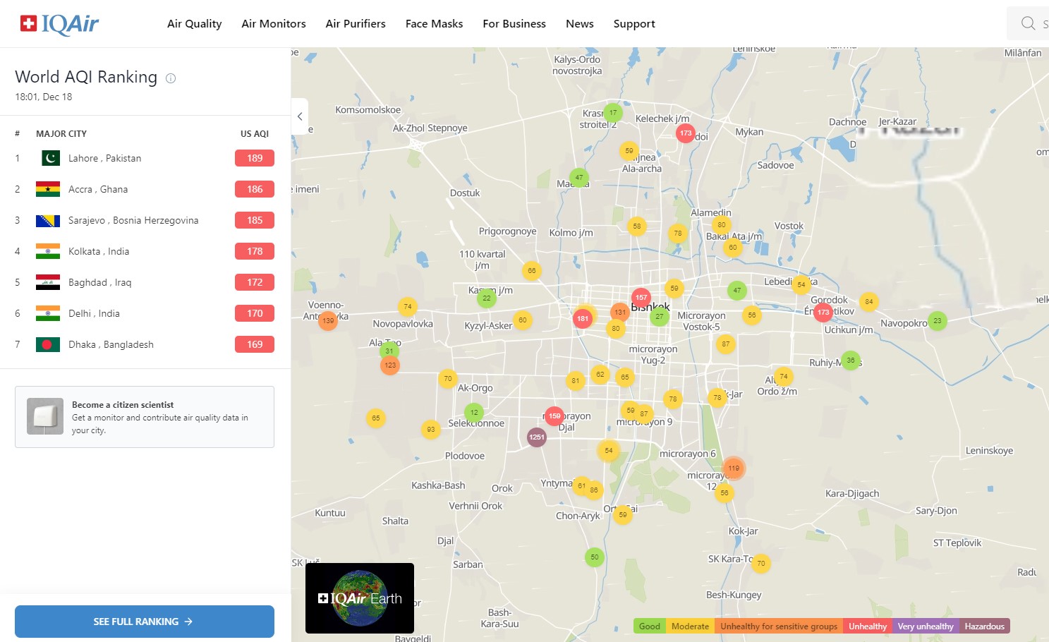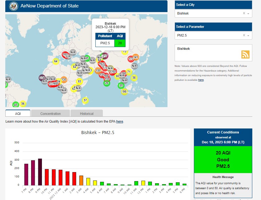 На территории посольства США в Кыргызстане также установлена станция. Информация обновляется каждый час. Индекс качества воздуха в районе дипломатической миссии «нездоровый» — 169 (AQI).