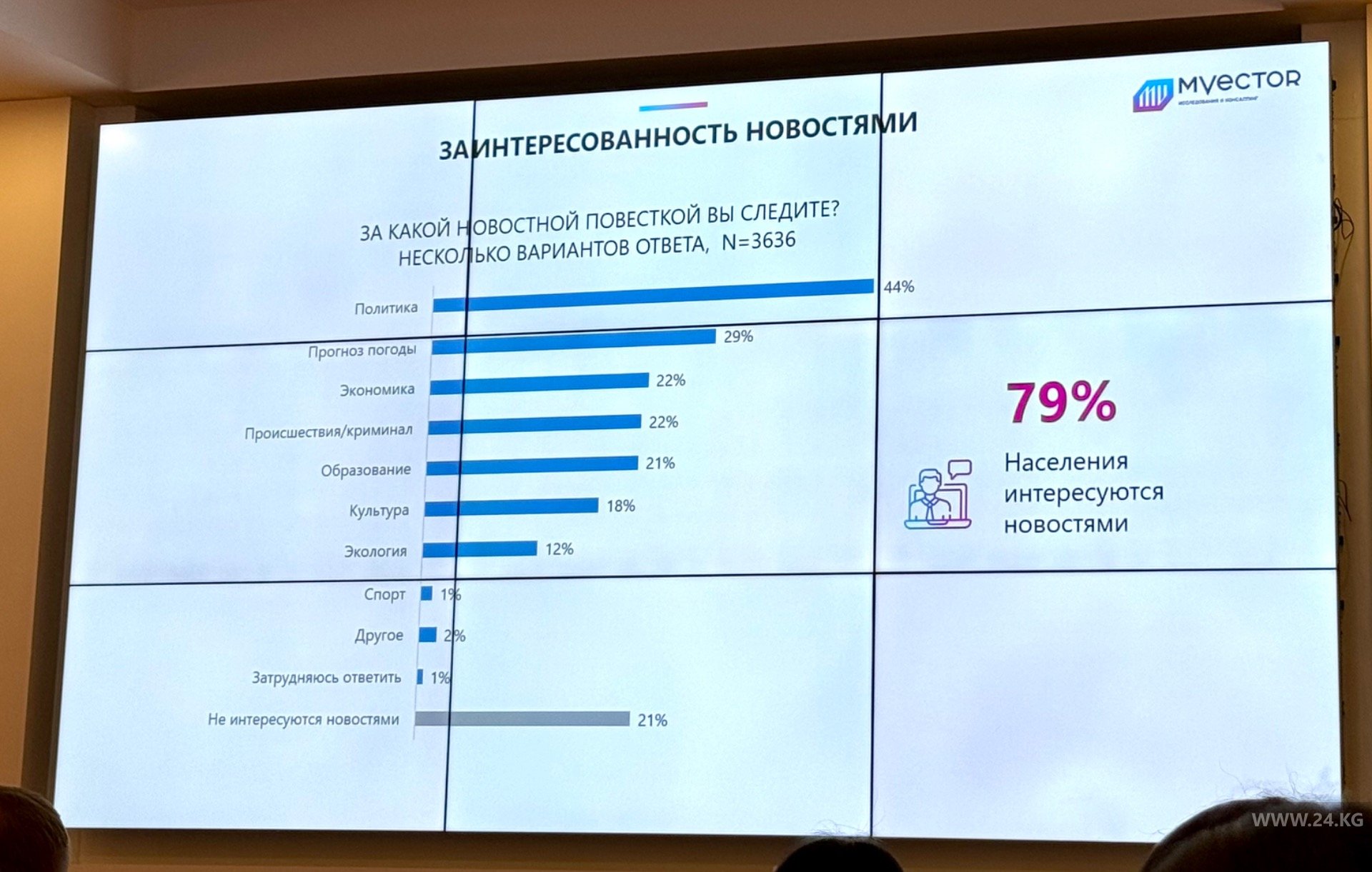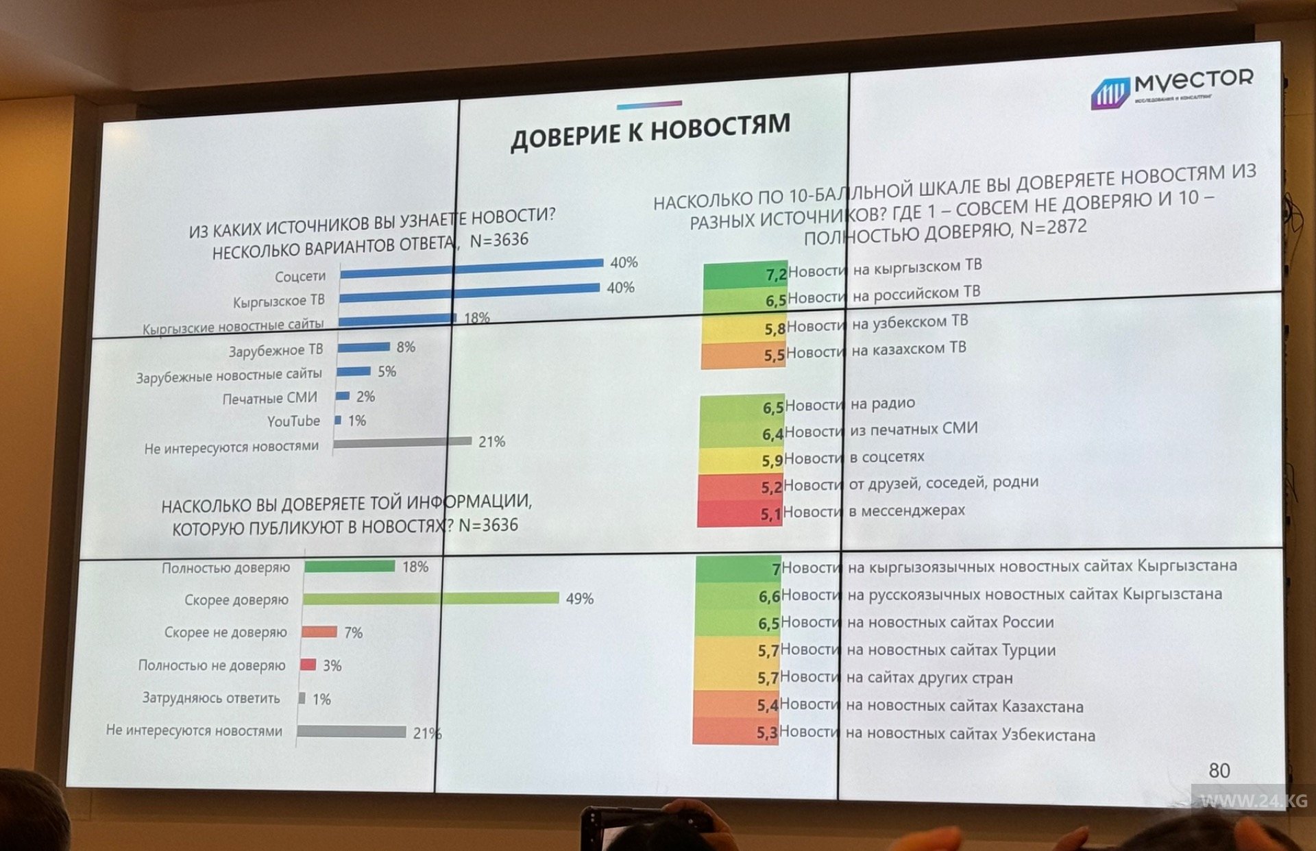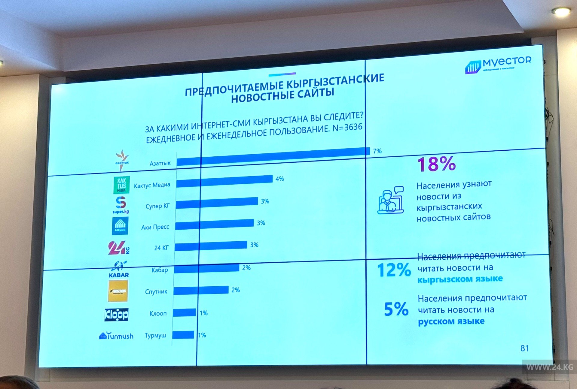 Информационное агентство 24-kg.com вошло в пятерку самых читаемых СМИ в республике. Об этом говорится в исследовании медиарынка «Восприятие и поведение медиааудитории Кыргызстана. 9-я волна», которое проведено исследовательско-консалтинговой компанией М-Vector совместно с Интерньюс в КР.