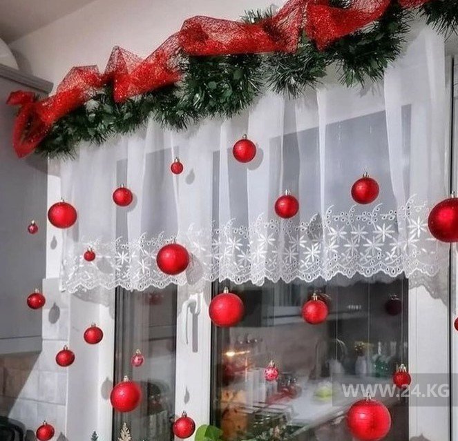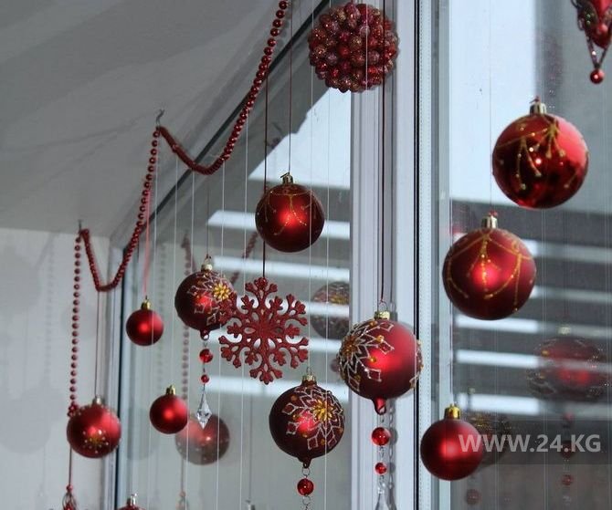 В других комнатах можно украсить окна композициями из елочных шаров. Придется потрудиться, чтобы расположить их в том порядке, который вам нравится. Но оно того стоит. Квартира сразу преображается. А можно просто украсить подоконники композициями из еловых веток и небольшими фигурками.