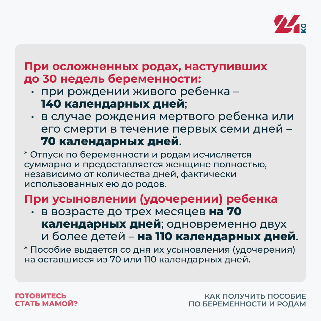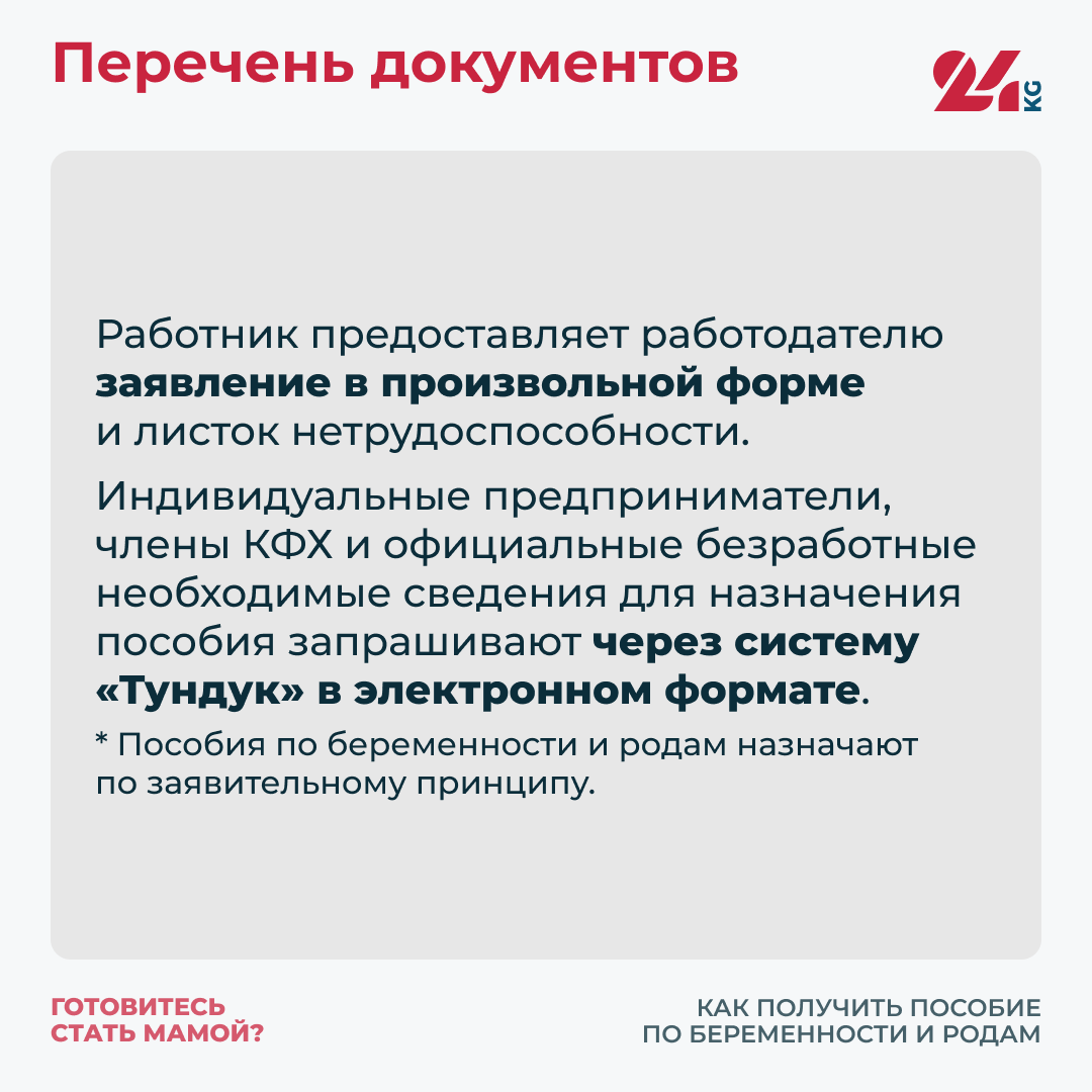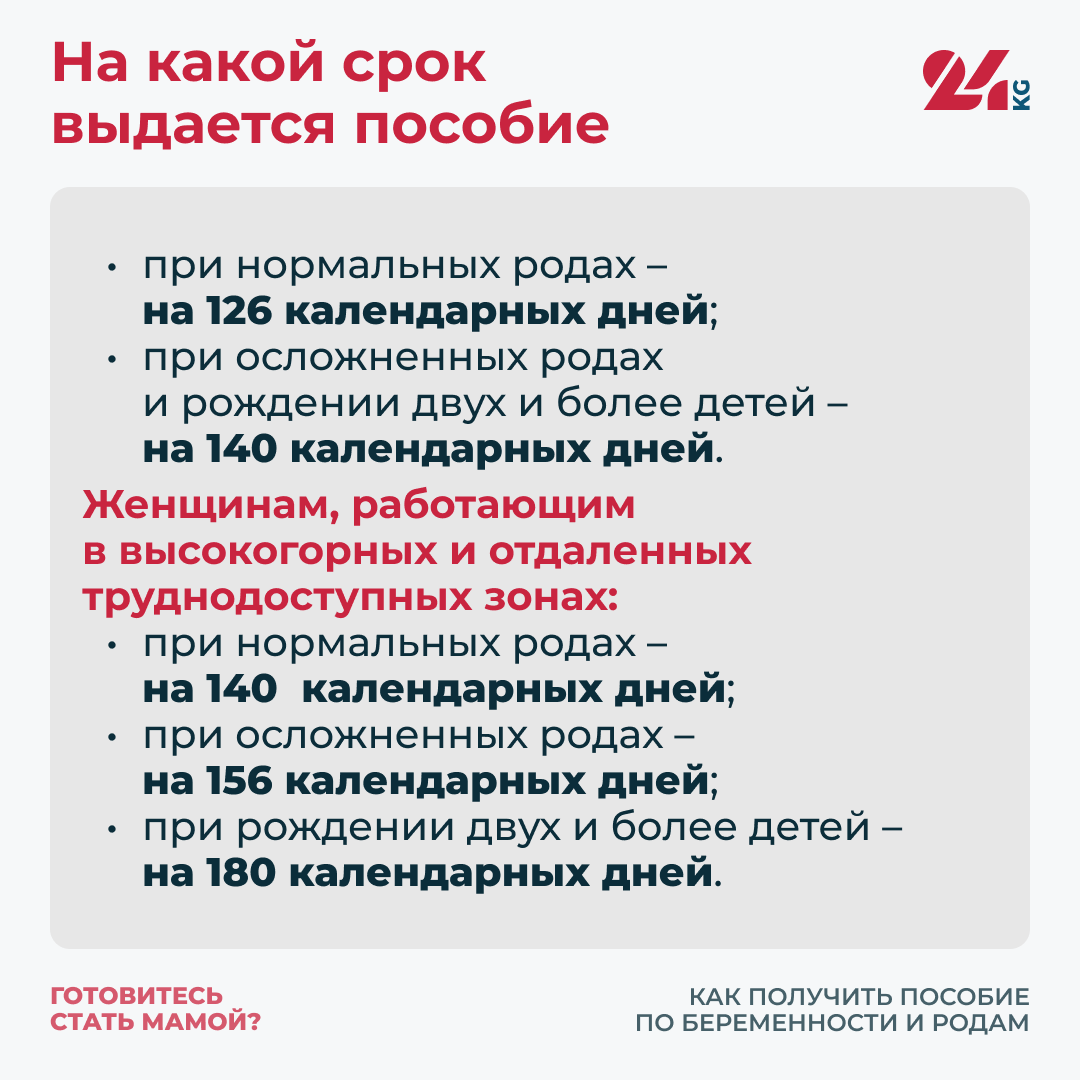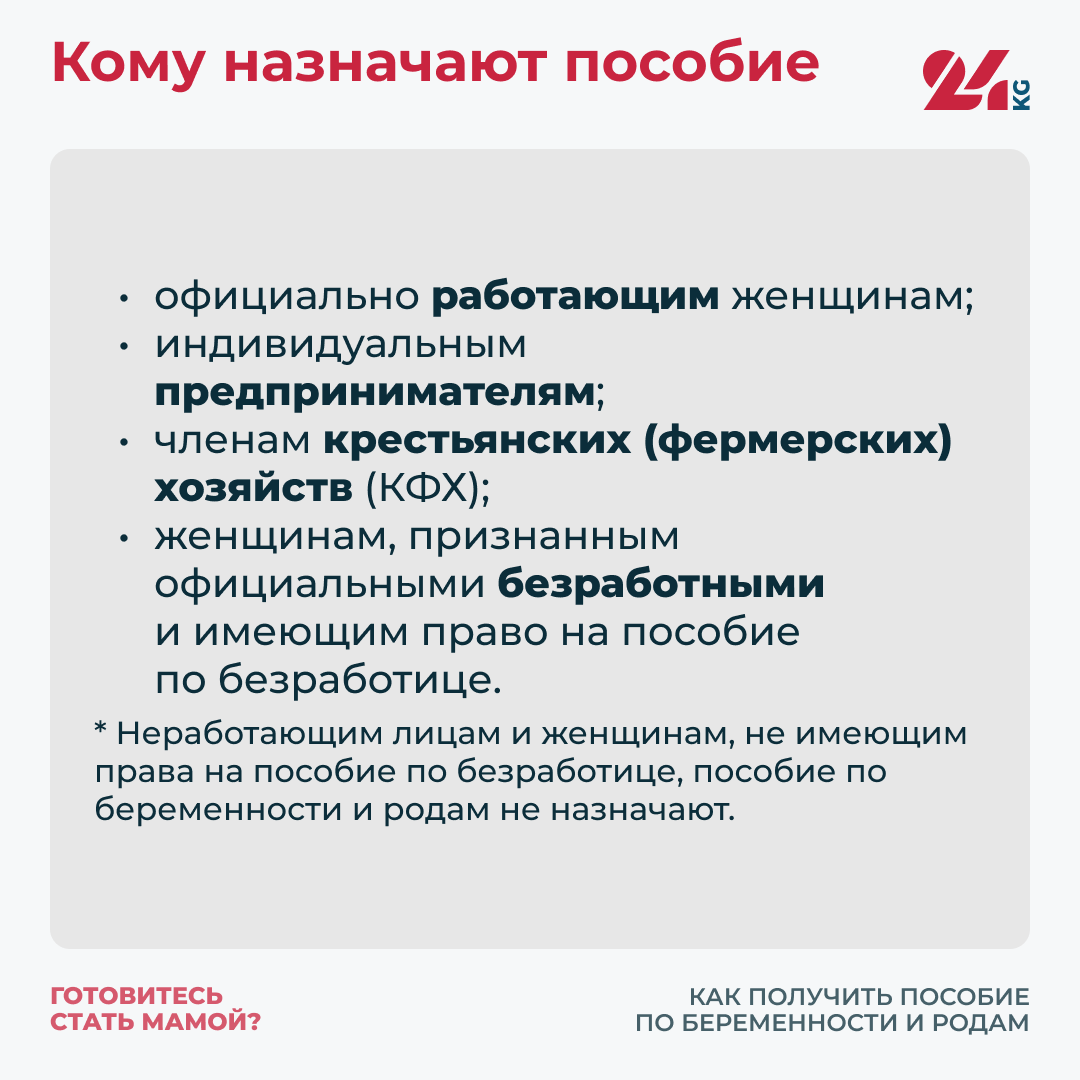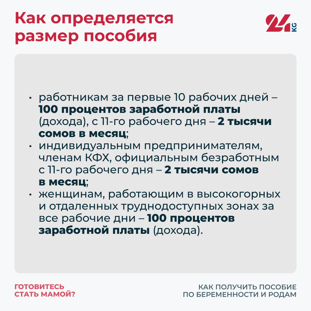 Размер пособия по беременности и родам, выплачиваемого за счет республиканского бюджета с 11-го рабочего дня, составляет 2 тысячи сомов в месяц. Однако финансовую поддержку от государства могут получить не все.