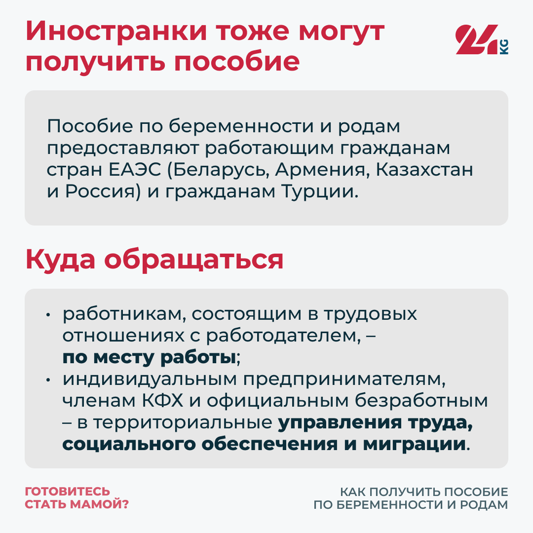 Пособие по беременности и родам предоставляют работающим гражданам стран ЕАЭС (Беларусь, Армения, Казахстан и Росcия) и гражданам Турции.