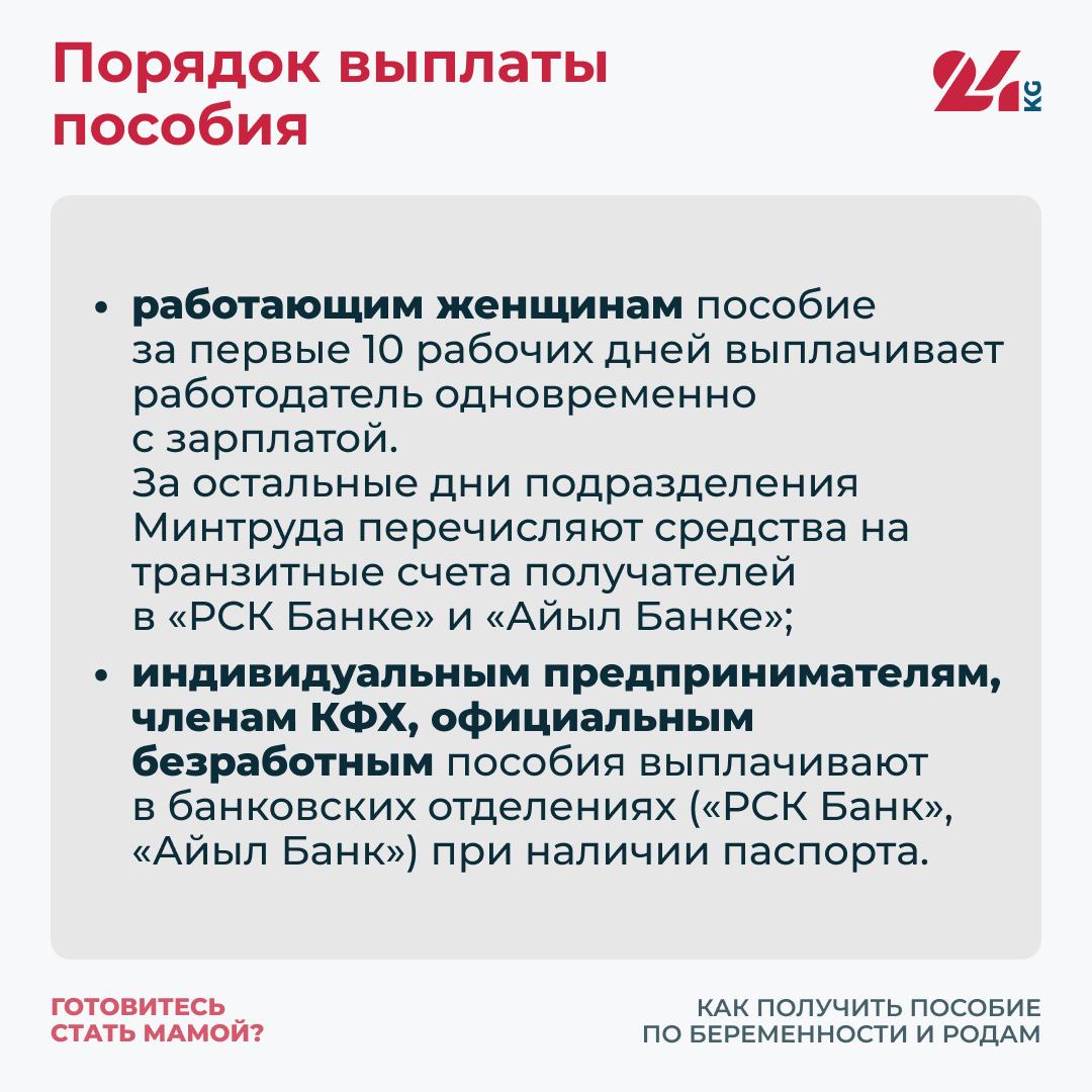 - работающим женщинам пособие за первые 10 рабочих дней выплачивает работодатель одновременно с зарплатой. За остальные дни подразделения Минтруда перечисляют средства на транзитные счета получателей в «РСК Банке» и «Айыл Банке»;