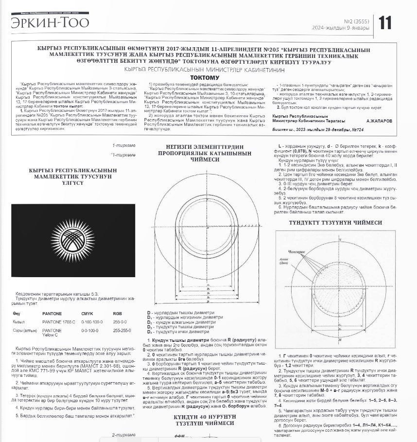 Кабинет министров официально опубликовал технические спецификации нового государственного флага. Документ размещен в сегодняшнем номере газеты «Эркин тоо».