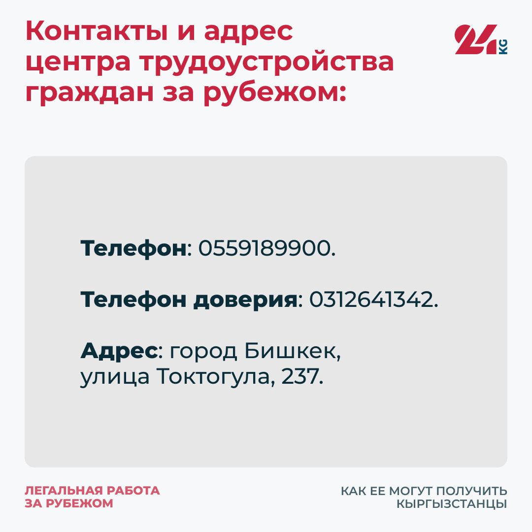 В Кыргызстане работает центр трудоустройства граждан за рубежом при Министерстве труда, социального обеспечения и миграции. Он помогает легально и безопасно устроиться на работу за границей.
