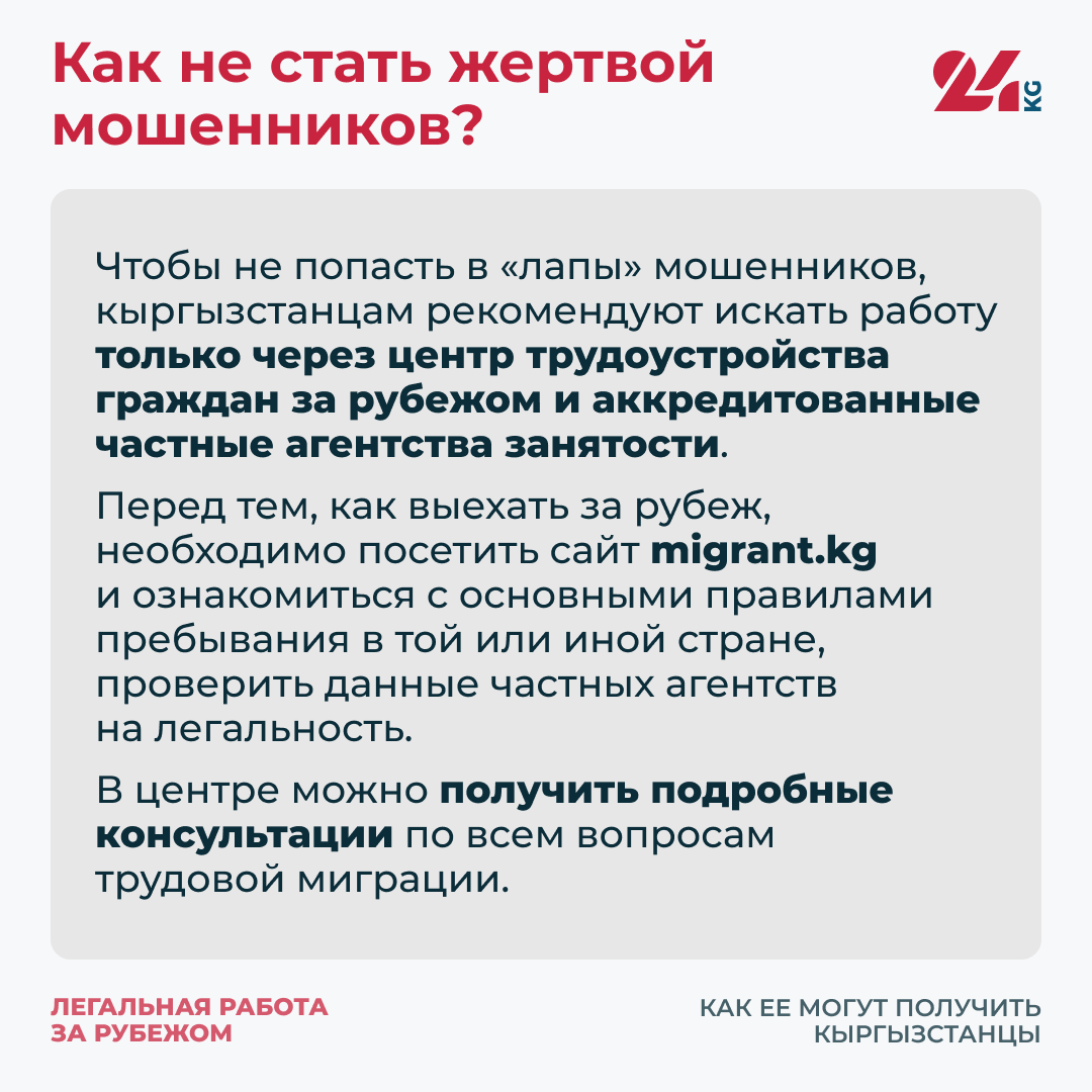 Чтобы не попасть в «лапы» мошенников, кыргызстанцам рекомендуют искать работу только через центр трудоустройства граждан за рубежом и аккредитованные частные агентства занятости.