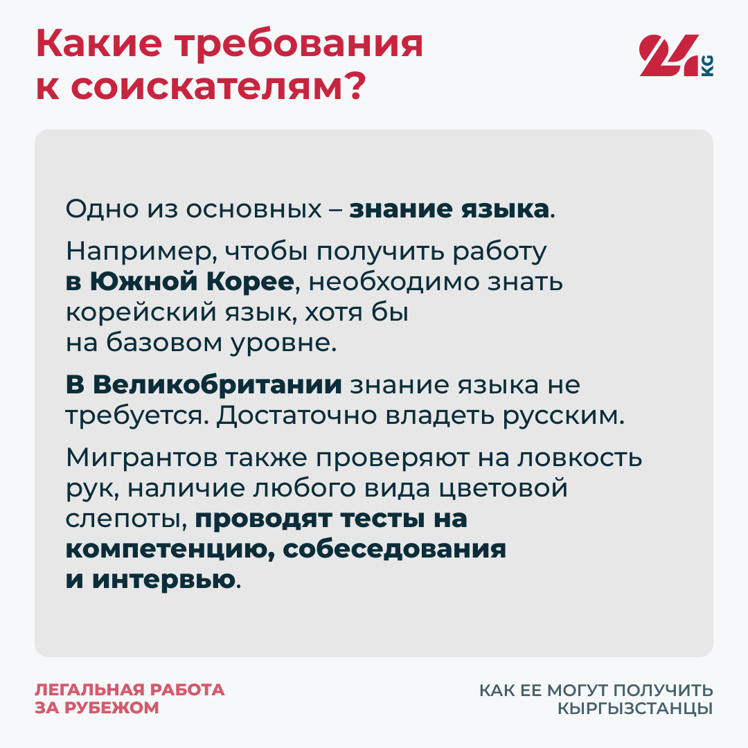 Кыргызстанцы также могут легально работать в Казахстане, Турции, Германии, Японии, государствах Персидского залива, Египте, некоторых странах Европы. Всего 25 государств.