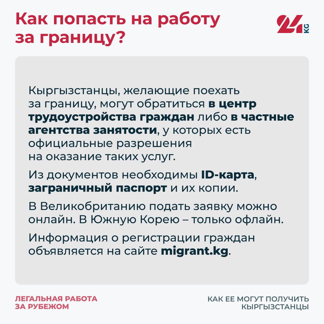 Кыргызстанцы, желающие поехать за границу, могут обратиться в центр трудоустройства граждан либо в частные агентства занятости, у которых есть официальные разрешения на оказание таких услуг.