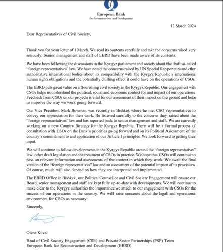 ЕБРР также напомнил о недавнем визите его вице-президента Марка Боумана в Бишкек, где он также встретился с представителями НПО. Он внимательно выслушал их опасения по поводу закона об «иностранных представителях» и доложил об этом высшему руководству и сотрудникам банка.