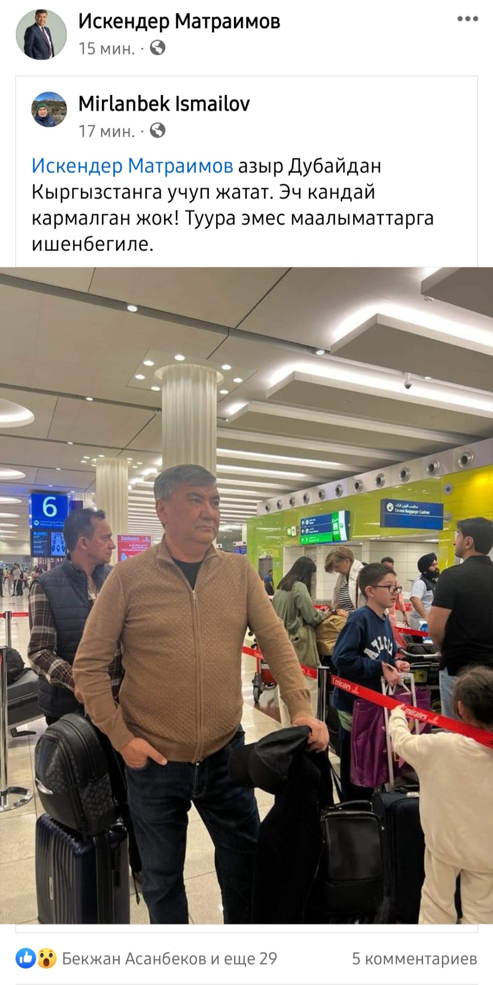 Экс-депутат Жогорку Кенеша и брат бывшего таможенника Райымбека Матраимова Искендер Матраимов находится в аэропорту Дубая и собирается вылететь в Кыргызстан. Об этом в соцсетях сообщил его сын Мирланбек Исмаилов.