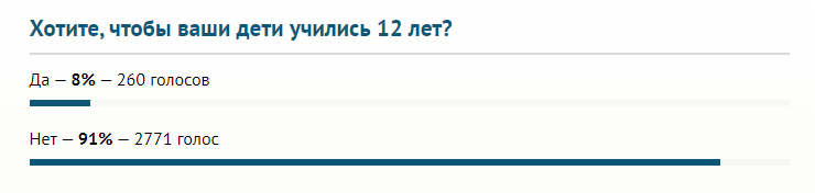 Согласно результатам, больше 91 процента респондентов (или 2,8 тысячи голосов) высказались против перехода на 12-летку. Лишь 8 процентов поддерживают озвученную чиновниками реформу.