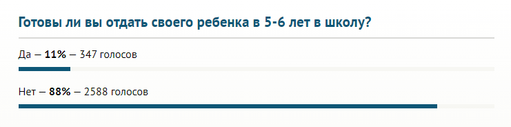 При этом 88 процентов респондентов (или почти 2,6 тысячи голосов) не готовы отдавать детей в школу в раннем возрасте. В Кыргызстане переводят школьное образование на 12-летнюю модель. Сейчас рабочая группа готовит дорожную карту поэтапного перехода.Сначала в кабмине сообщали, что обязательным школьным образованием будут охвачены 100 процентов пяти- и шестилетних детей. Позже президент Кыргызской академии образования Назира Дюшеева отметила, что возраст поступления в первый класс составит шесть-семь лет, а при согласии родителей — 5,5.