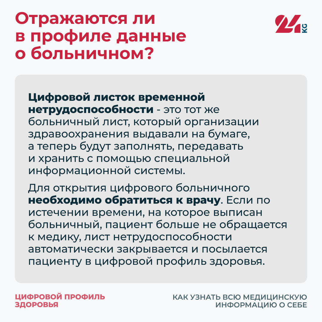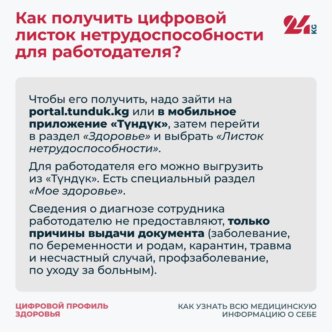 Чтобы его получить, надо зайти на portal.tunduk.kg или в мобильное приложение «Түндүк», затем перейти в раздел «Здоровье» и выбрать «Листок нетрудоспособности».