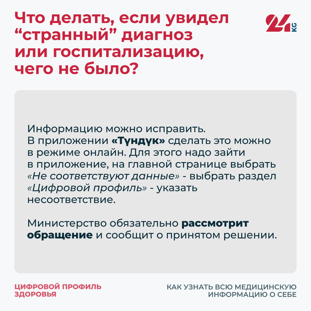 Информацию можно исправить. В приложении «Түндүк» сделать это можно в режиме онлайн. Для этого надо зайти в приложение, на главной странице выбрать «Не соответствуют данные» — выбрать раздел «Цифровой профиль» — указать несоответствие. Министерство обязательно рассмотрит обращение и сообщит о принятом решении.