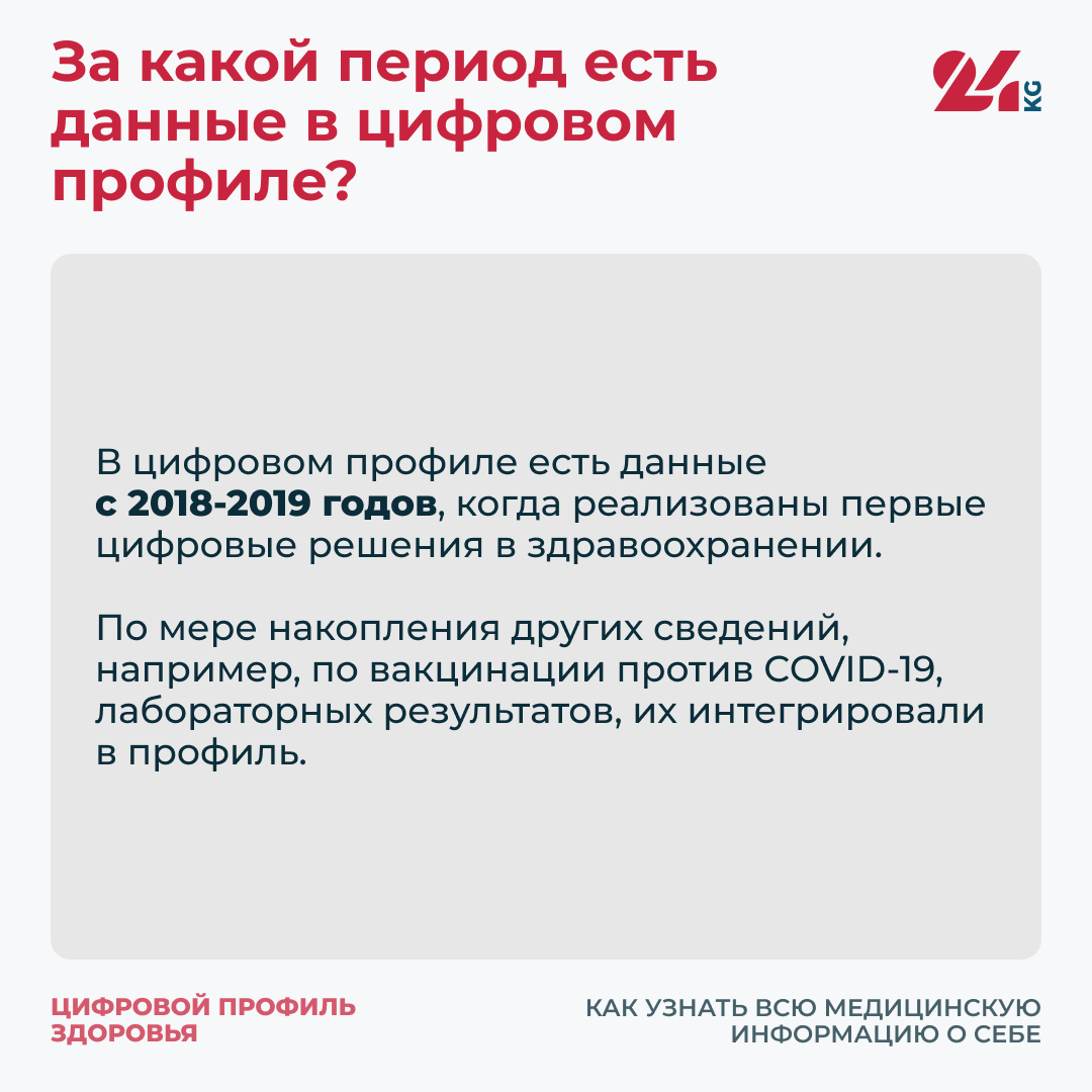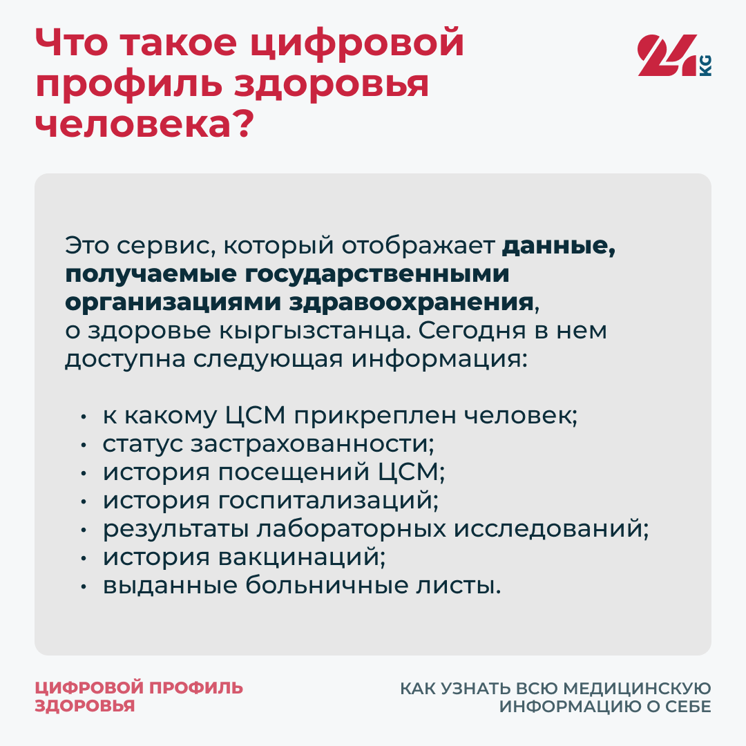 Это сервис, который отображает данные, получаемые государственными организациями здравоохранения, о здоровье кыргызстанца. Сегодня в нем доступна следующая информация: