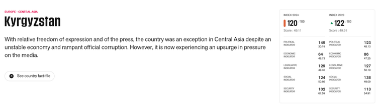 Кыргызстан занял 120-е место во Всемирном индексе свободы прессы в этом году, который опубликован международной организацией «Репортеры без границ» (RSF). В прошлом рейтинге республика находилась на 122-м месте.