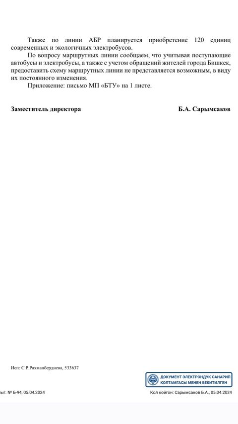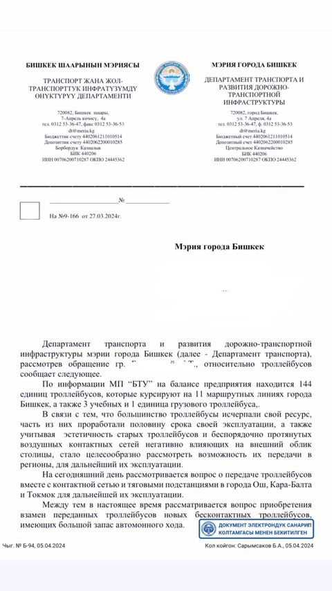 В ответе на запрос ответили, что «рассматривается вопрос о передаче троллейбусов вместе с контактной сетью и тяговыми подстанциями в Ош, Кара-Балту и Токмак для дальнейшей их эксплуатации».