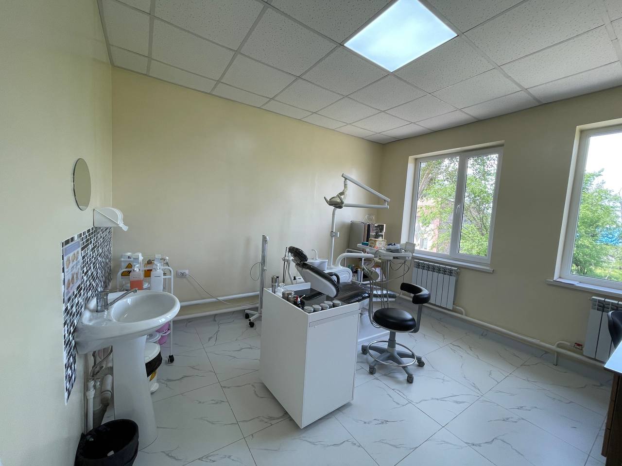 В двухэтажном здании общей площадью 250 квадратных метров имеются 9 врачебных кабинетов, 2 кабинета для медицинских сестер, 1 карантинная, имеются кухня и склад.