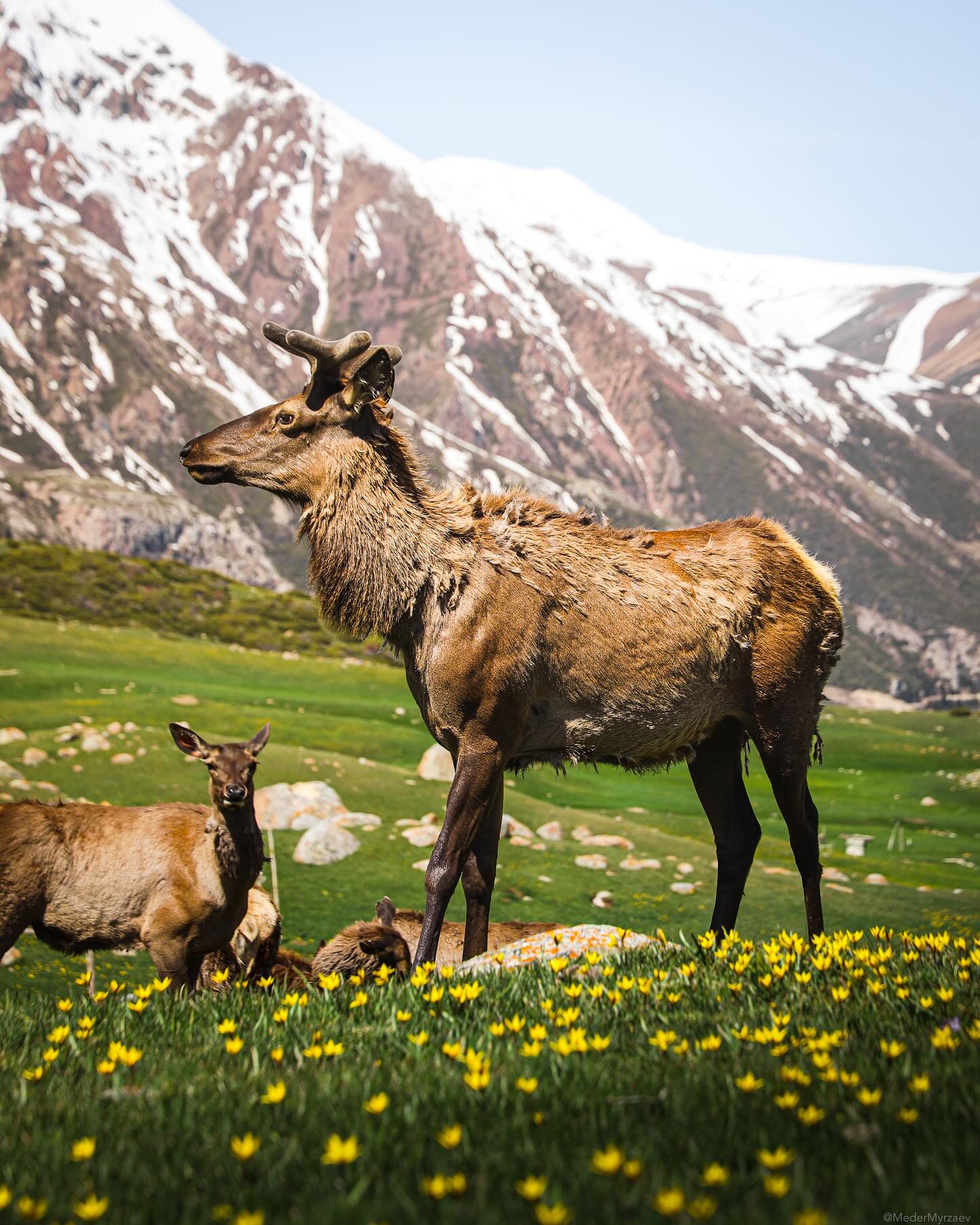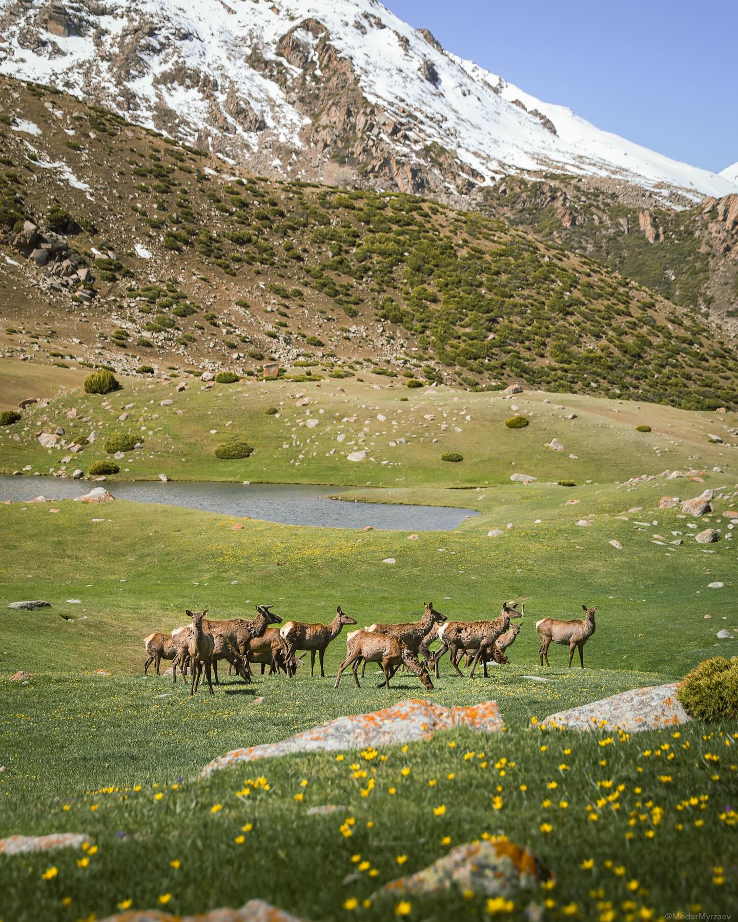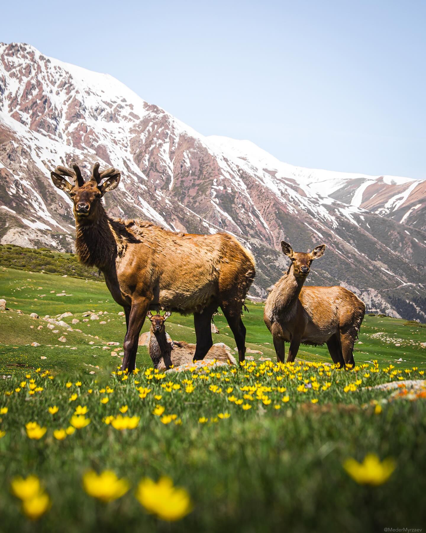 Блогер Медер Мырзаев на своей странице в Facebook опубликовал фотографии маралов на территории природного заповедника «Беш-Таш» в Таласе.