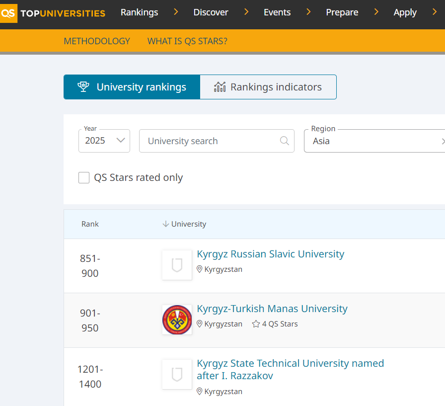 По ее данным, из 1 тысячи 503 вузов мира Кыргызско-Российский Славянский университет занимает место в ряду 851-900, Кыргызско-Турецкий университет «Манас» — 901-950 и Кыргызский государственный технический университет — 1201-1400.