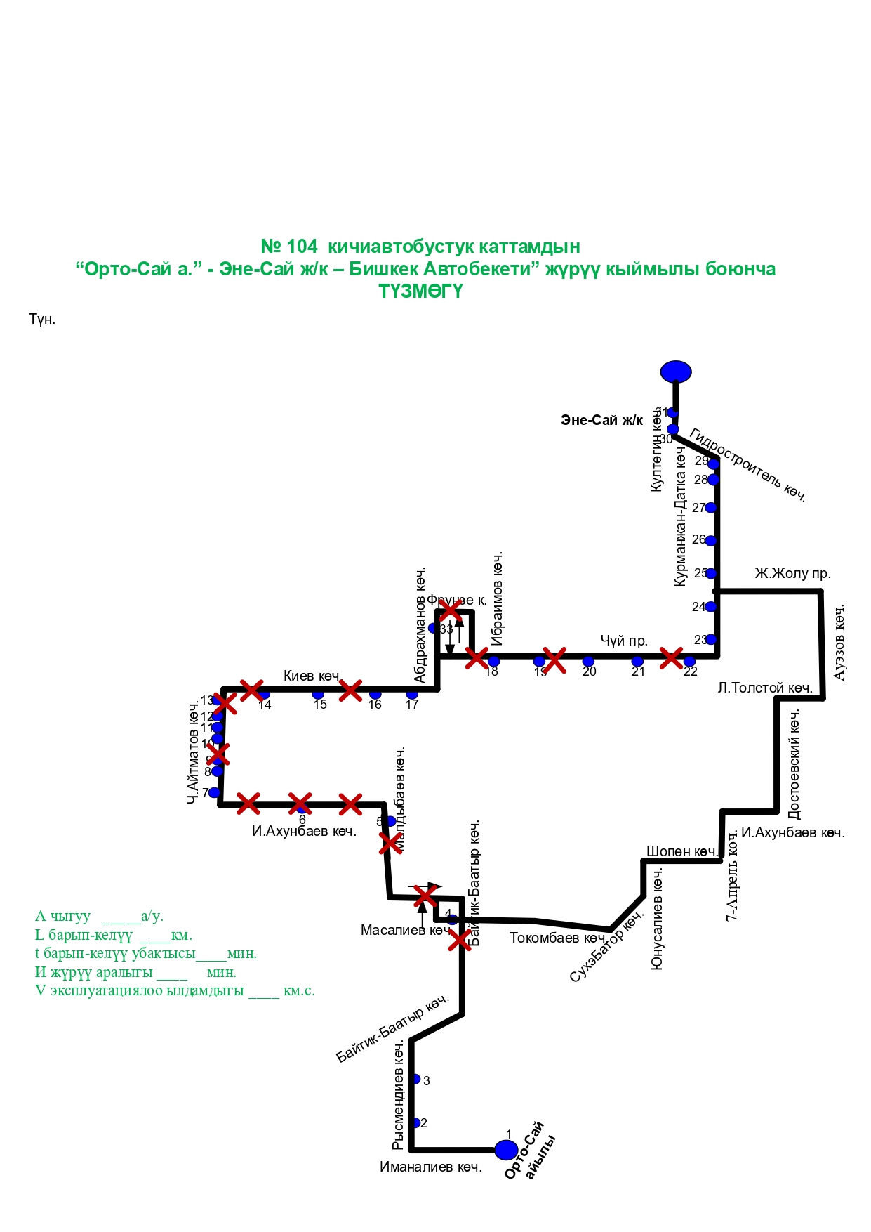 - № 104 — жилмассив «Эне-Сай», улицы Култегин, Гидростроитель, Курманджан Датки, проспект Жибек Жолу, улицы Ауэзова, Толстого, Достоевского, Ахунбаева, 7 Апреля, Шопена, Юнусалиева, Сухэ-Батора, Токомбаева, Байтика Баатыра, Рысмендиева, Иманалиева, село Орто-Сай;